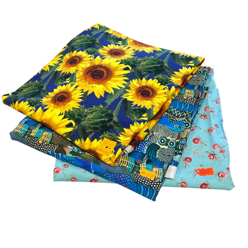 Hledáte kvalitní materiál pro své šití za zlomek běžné ceny? Tento balíček je sestaven pro všechny švadlenky, které rády kombinují vzory a tvoří originální kousky. Obsahuje přesně ty látky, které jsou vyobrazeny na úvodním obrázku - výrazné slunečnice, hravý abstraktní motiv a jemné kvítky.
