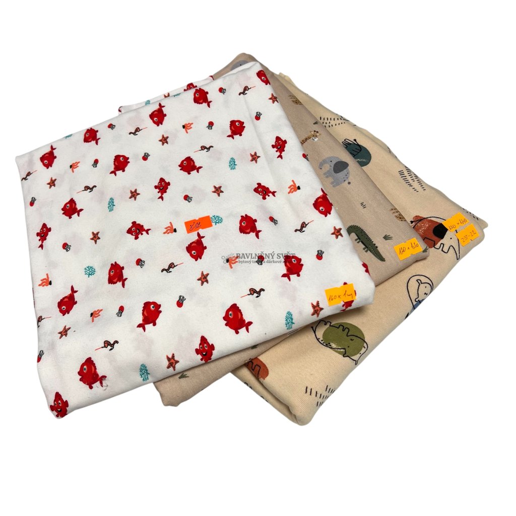Tento extra velký balíček prostřihů vám nabízí celkem 3,70 m materiálu pro vaše menší i větší projekty. Sada je ideální pro šití dětského oblečení, kde oceníte hravé vzory a vysokou kvalitu materiálu. V balíčku najdete přesně to, co je na obrázku: bílý úplet s červenými rybičkami, béžový motiv se safari zvířátky a jemný vzor s hrošíky.