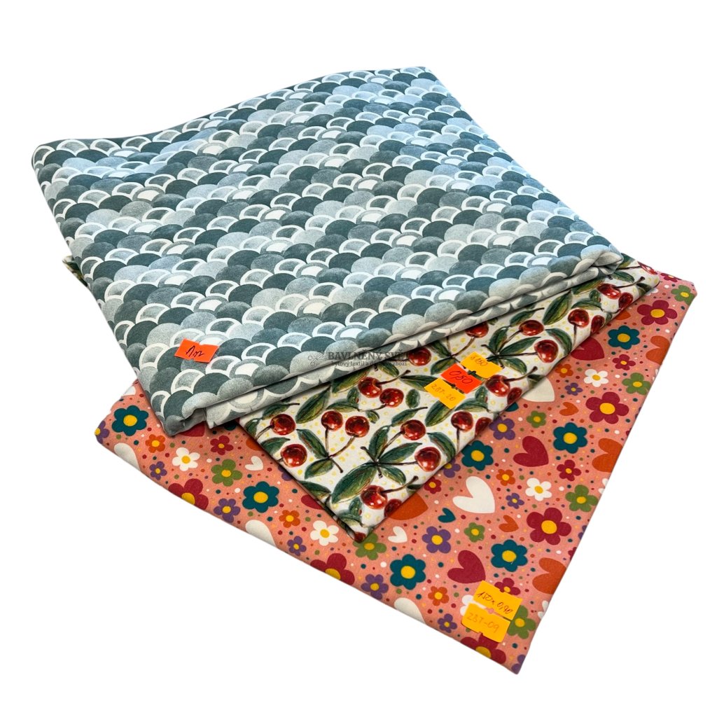 Hledáte inspiraci pro své další šití? Tento balíček o celkové délce 2,4 m kombinuje moderní i tradiční vzory, které můžete kombinovat třeba s jednobarevným úpletem. V sadě najdete přesně to, co vidíte na obrázku: stylový vzor šupin v šedozeleném odstínu, svěží motiv zralých třešní a hravý potisk s kytičkami a srdíčky na růžovém podkladu.