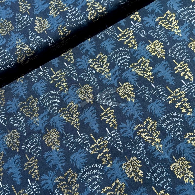 metráž - plátno VÁNOČNÍ - STROMEČKY na MODRÉM š.140cm