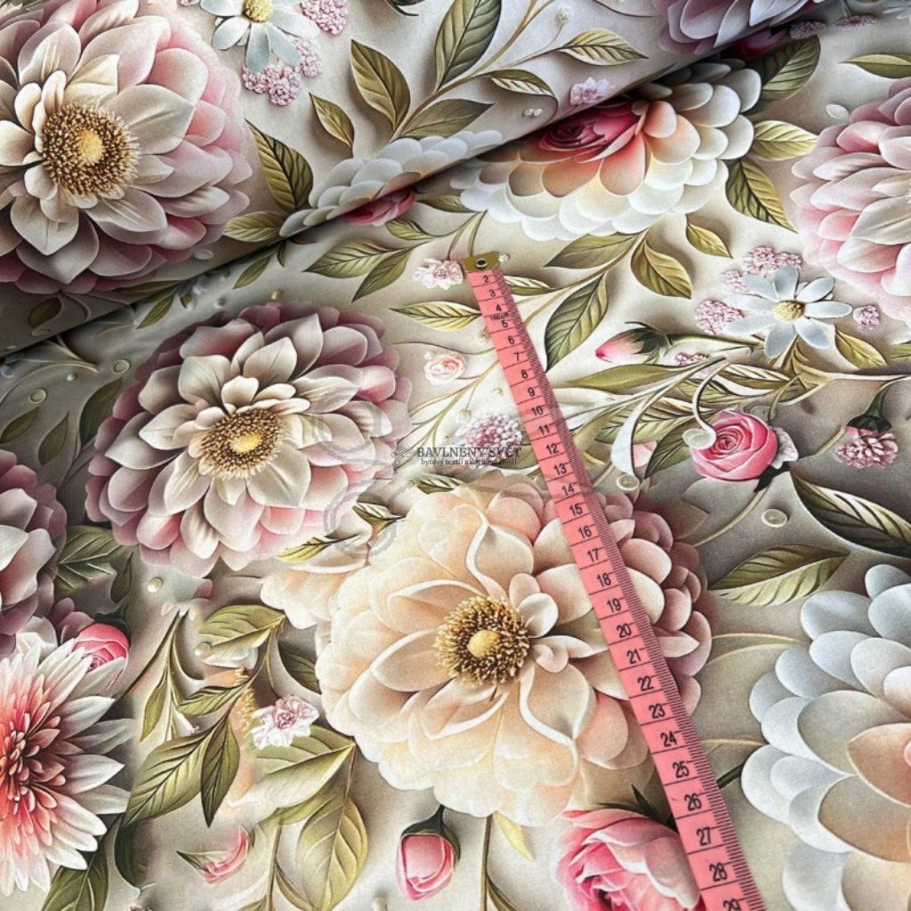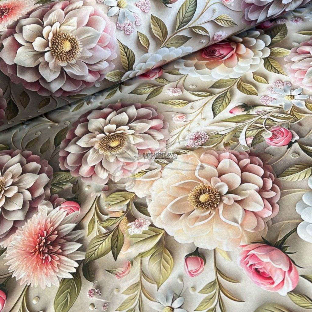 Proměňte svůj domov v kvetoucí oázu s naším prémiovým bavlněným plátnem s revolučním 5D digitálním tiskem. Tento motiv je oslavou přírody, kombinuje vznešenost růží, plnost rozkvetlých Jiřin a jemnost drobného lučního kvítí. Každý okvětní lístek je díky 5D efektu vykreslen s fascinující hloubkou, která dodává materiálu luxusní a umělecký rozměr.