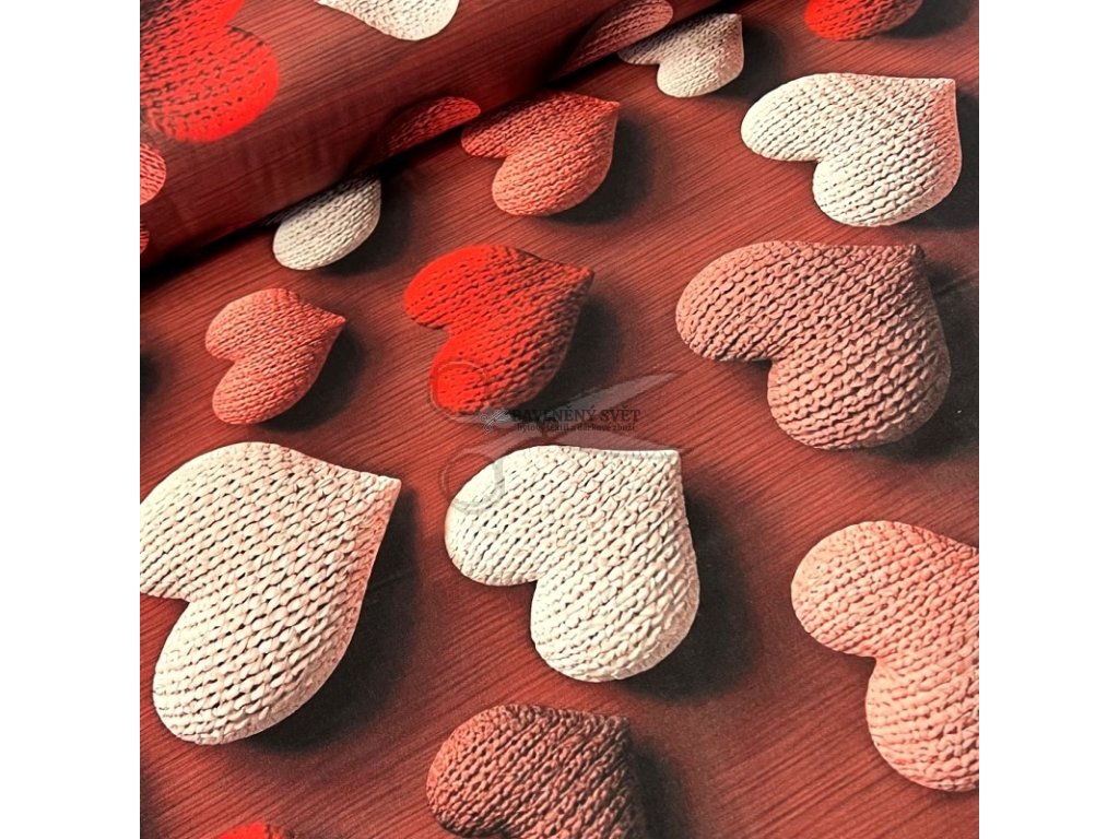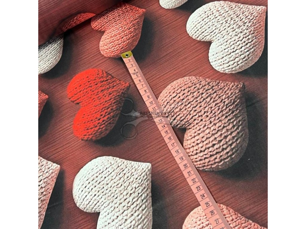 Exkluzivní bavlněné plátno s 5D efektem pletených srdíček přináší do vaší ložnice neuvěřitelný pocit tepla a útulnosti. Pokud hledáte něco skutečně výjimečného, co na první pohled zaujme každou návštěvu, tak naše bavlněné plátno je mistrovským dílem moderního tisku. Každé srdíčko na látce vypadá, jako by bylo právě ručně upleteno z té nejměkčí vlny a položeno na dřevěný podklad. Tato optická iluze dodává materiálu hloubku, kterou u běžných tisků nenajdete.