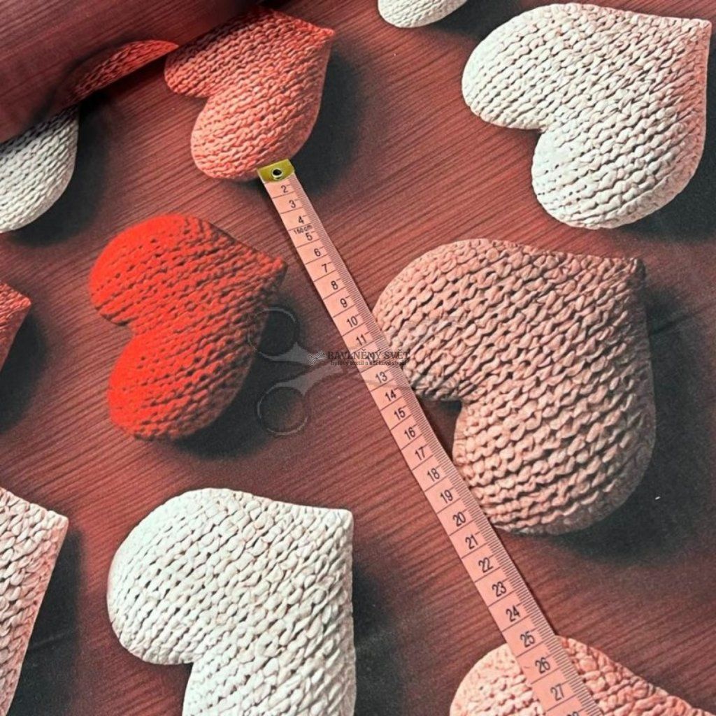 Exkluzivní bavlněné plátno s 5D efektem pletených srdíček přináší do Vaší ložnice neuvěřitelný pocit tepla a útulnosti. Pokud hledáte něco skutečně výjimečného, co na první pohled zaujme každou návštěvu, tak naše bavlněné plátno je mistrovským dílem moderního tisku. Každé srdíčko na látce vypadá, jako by bylo právě ručně upleteno z té nejměkčí vlny a položeno na dřevěný podklad. Tato optická iluze dodává materiálu hloubku, kterou u běžných tisků nenajdete.