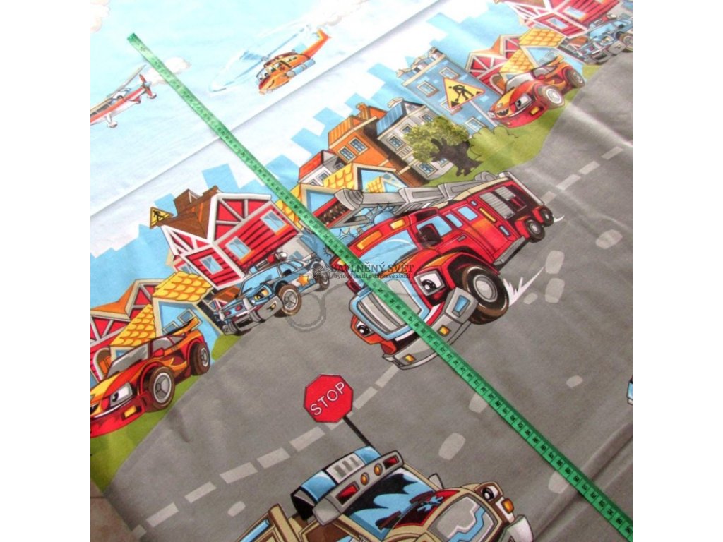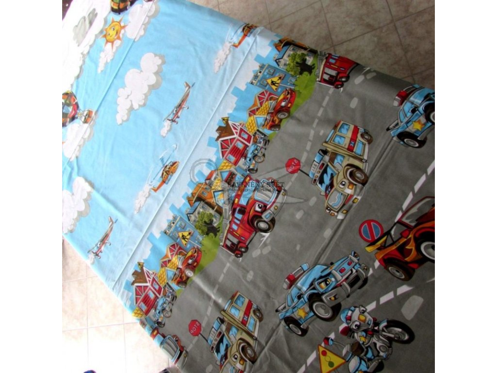 Tato látka je mezi našimi zákaznicemi naprostým hitem a pro její velký úspěch ji naskladňujeme opakovaně. Jedná se o vzor typu bordura, což znamená, že celá scéna je orientována na šířku látky (od jednoho pevného kraje k druhému). Spodní část plátna zdobí silnice s autíčky, zatímco horní část přechází v nebe s vrtulníky a létajícími balony. Plátno je pevné, hustě tkané a velmi jemné na dotek, takže je ideální pro každodenní používání.