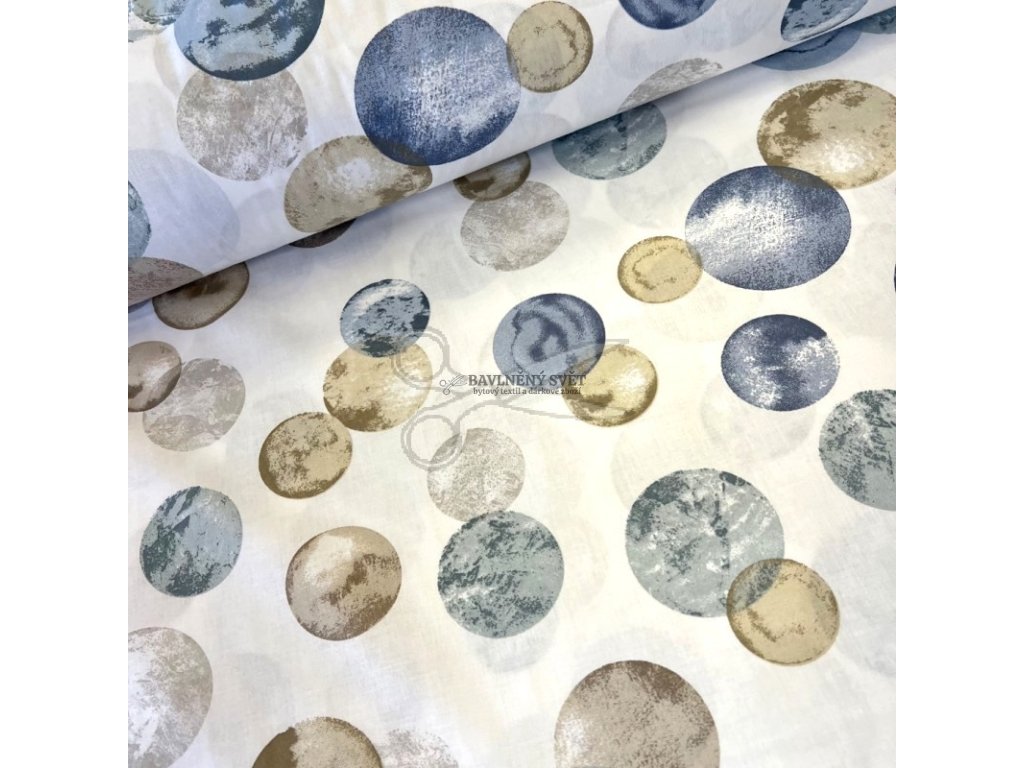 Toto 100% bavlněné plátno zaujme moderním vzorem jemně rozpitých bublin, které působí jako akvarelová malba. Barevná kombinace tlumené modré a béžové na světlém podkladu je klidná, elegantní a nadčasová, díky čemuž se látka skvěle hodí do moderních i klasických interiérů. Hlavním benefitem tohoto plátna je nadstandardní šíře 240 cm, která vám umožní tvořit i ty největší projekty z jednoho celistvého kusu materiálu, což zajistí profesionální výsledek bez rušivých spojů.