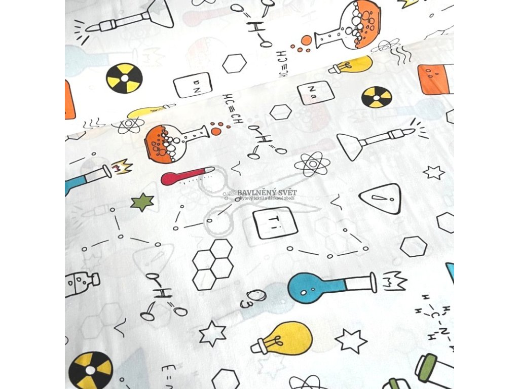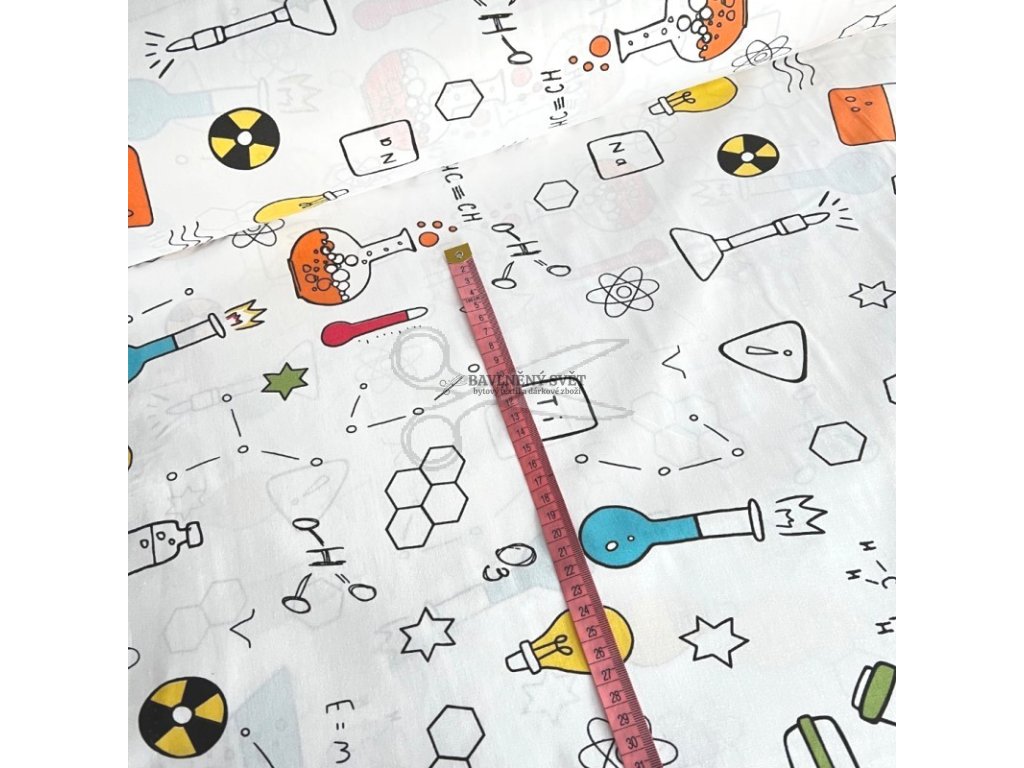 Tento vzor vás nadchne, najdete zde vše od kádinek a teploměrů až po vzorce a symboly nebezpečí, které dodávají látce ten správný vědecký šmrnc. Pro vaše projekty je důležité vědět, že vzor směřuje na šířku látky, tedy od jednoho pevného kraje k druhému. Plátno je pevné, hustě tkané a velmi příjemné na dotek, takže se v něm bude vašim dětem krásně usínat.