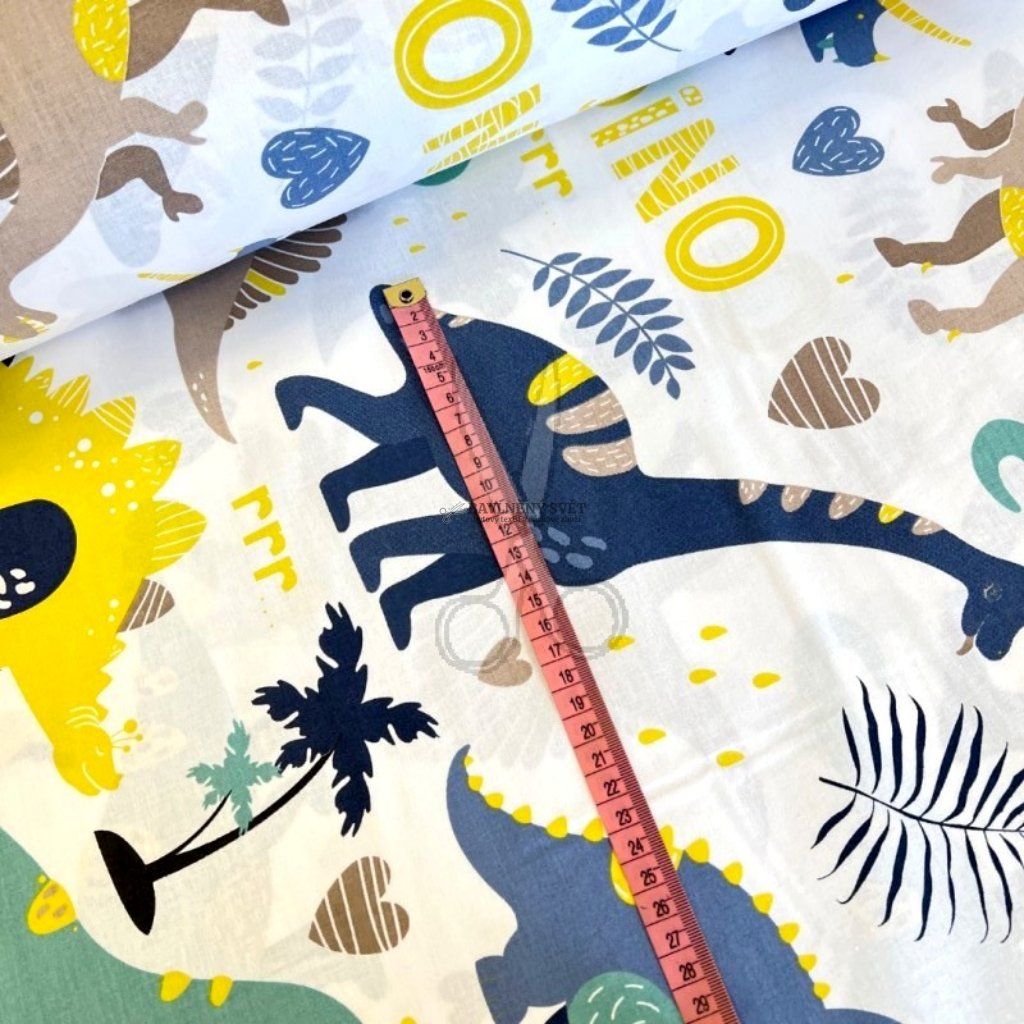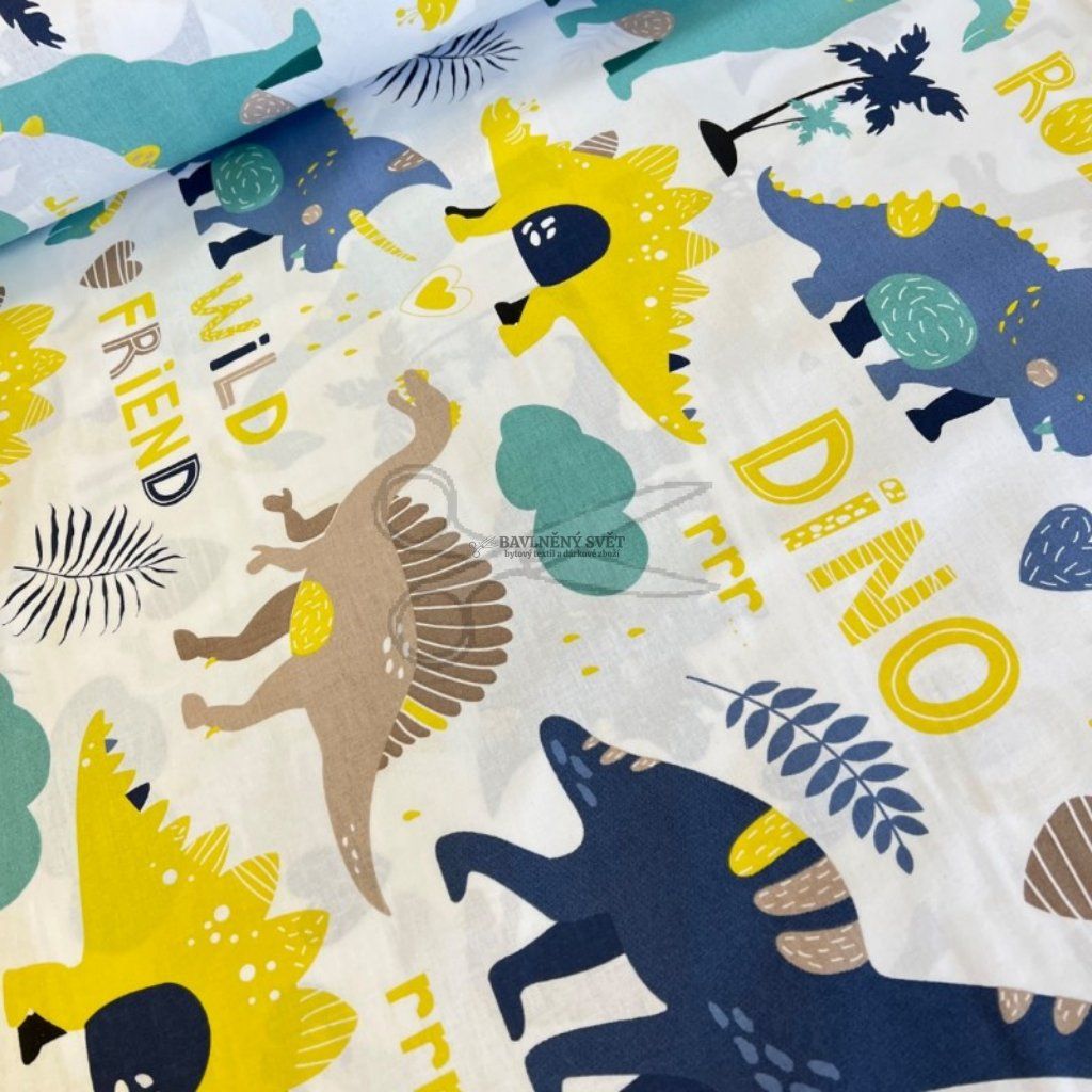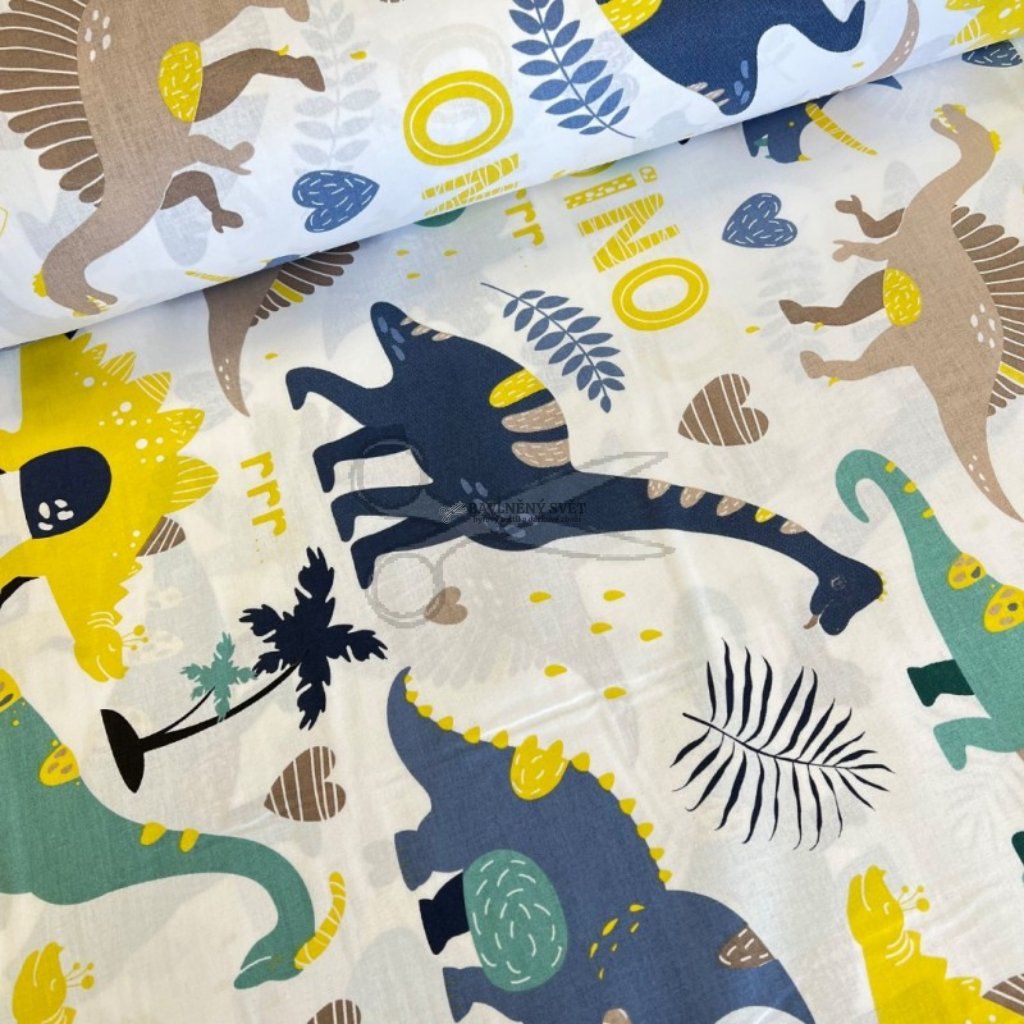 Toto plátno Vás zaujme pestrým vykreslením různých druhů dinosaurů, které na bílém podkladu krásně vyniknou. Pro Vaše šití je důležité, že vzor dinosaurů je orientován na šířku látky, tedy od jednoho pevného kraje k druhému, což oceníte zejména při stříhání dětského povlečení. Látka je pevná, hustě tkaná a velmi příjemná na dotek, takže je vhodná pro každodenní kontakt s dětskou pokožkou