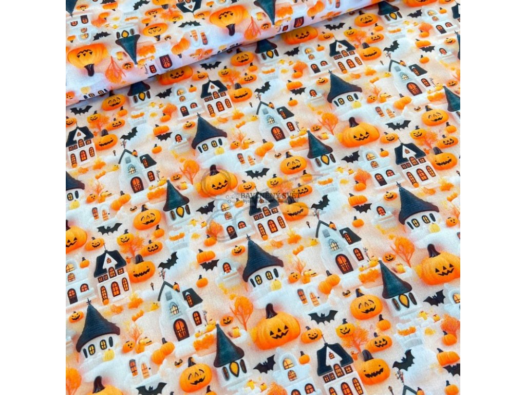 Tato prémiová bavlna je díky speciální úpravě enzymací mnohem hladší a příjemnější na omak než běžná plátna, což ji spolu s nižší gramáží činí ideální pro šití věcí, u kterých vyžadujete lehkost a jemnost. Výrazný motiv zářivých dýní, netopýrů a tajuplných domečků na světlém podkladu je jako stvořený pro výrobu sezónních doplňků, které okamžitě navodí tu správnou podzimní atmosféru.