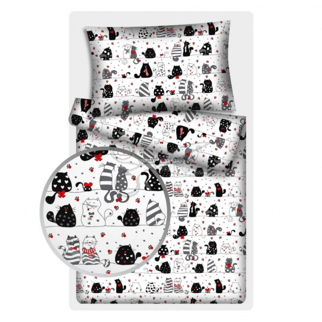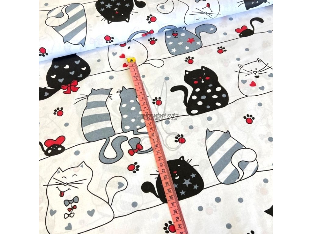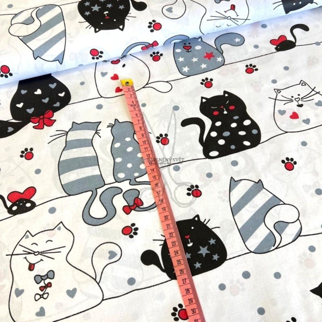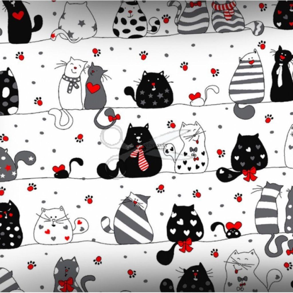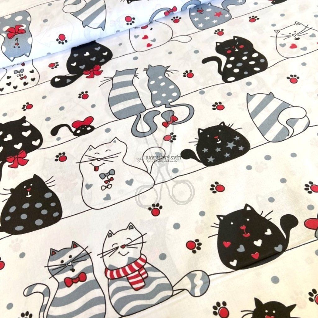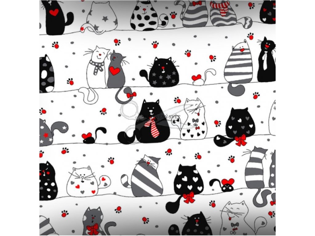 Rozveselte svůj domov tímto originálním vzorem! Elegantní kočky s mašličkami, kravatami a srdíčky vnesou do každého interiéru vtip a moderní styl. Díky certifikaci pro děti do 3 let je toto plátno perfektní volbou pro šití doplňků, které jsou prodyšné, měkké a velmi příjemné na dotek.