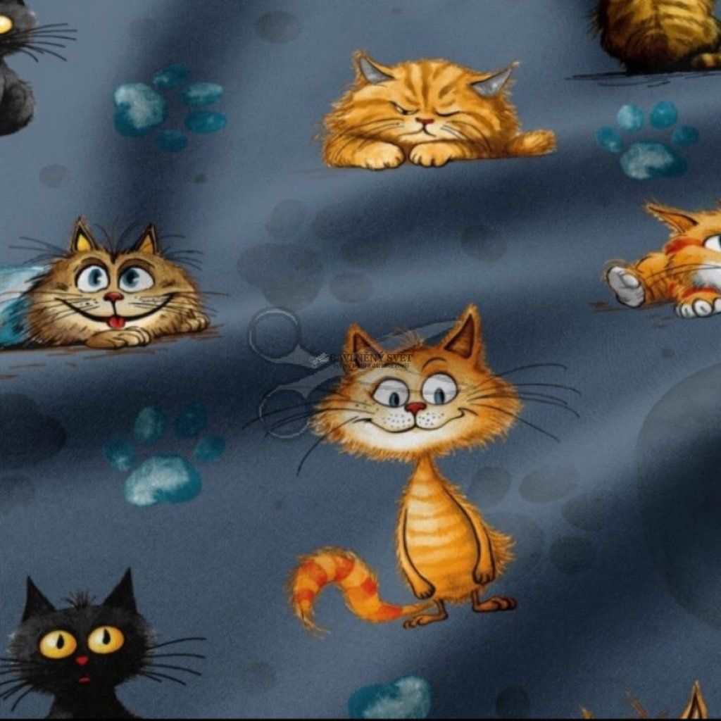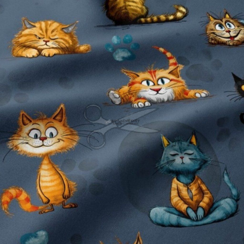 Bavlněná látka KOČKY na TMAVĚ MODRÉM šíře 160 cm