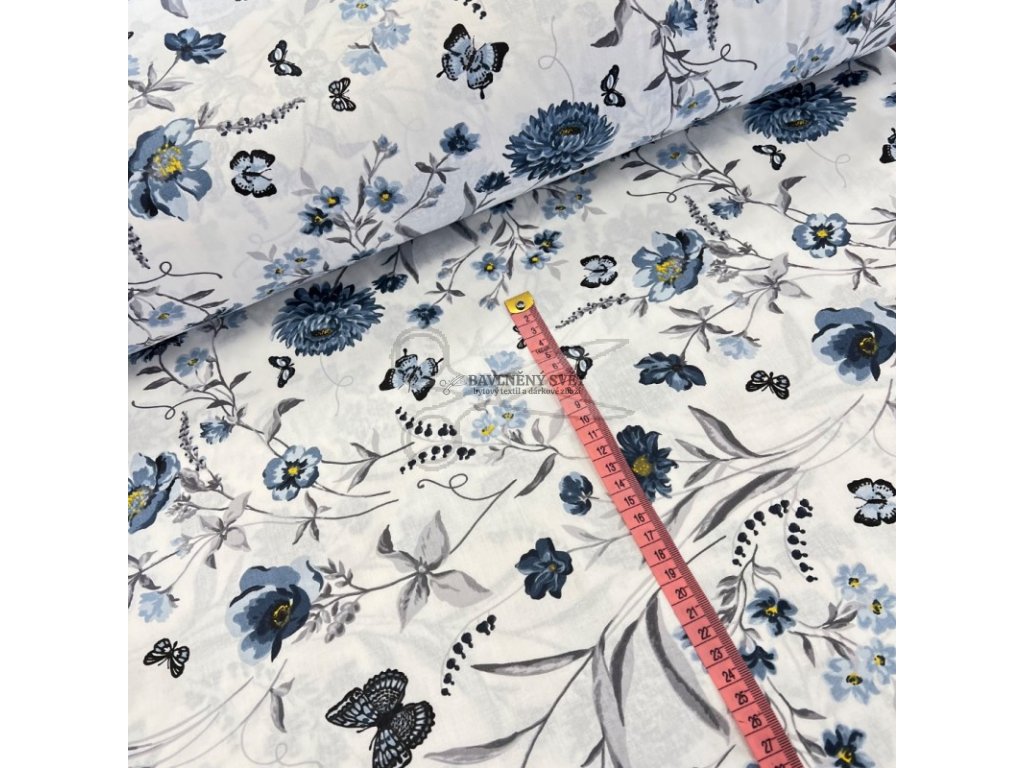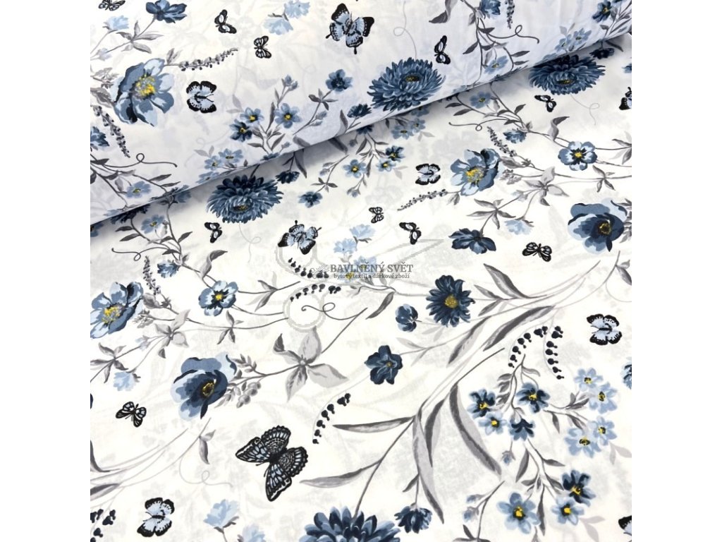 Bavlněná látka KVĚTINY s MOTÝLKEM modré šíře 240 cm