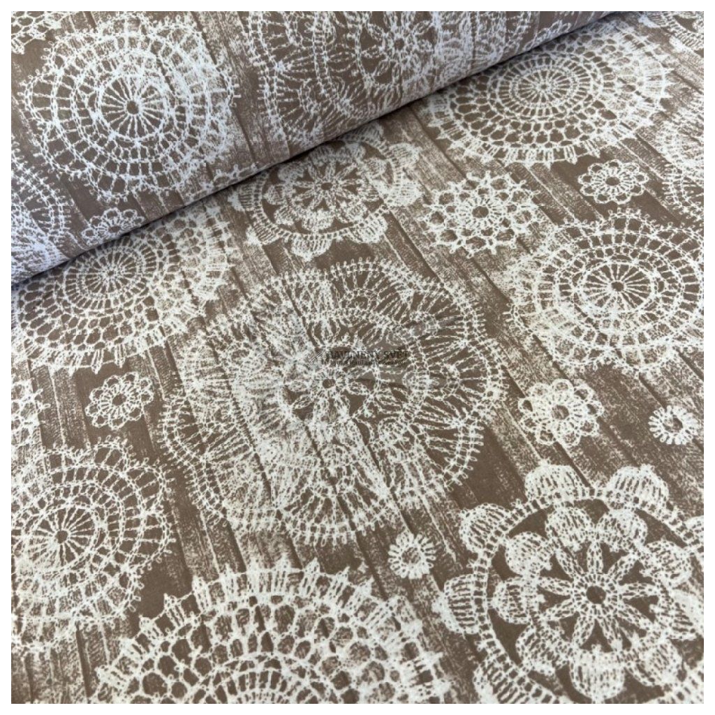 Toto 100% bavlněné plátno v šířce 240 cm vyniká svým detailním tiskem, který věrně zachycuje jemnost krajkových motivů. Hnědý podklad dodává vzoru hloubku a stabilitu, díky čemuž látka působí velmi elegantně a luxusně. Každý v tomto vzoru může vidět něco jiného - od duchovních mandal až po babiččiny poctivě háčkované dečky - a právě tato vícevýznamovost dělá látku nadčasovou.
