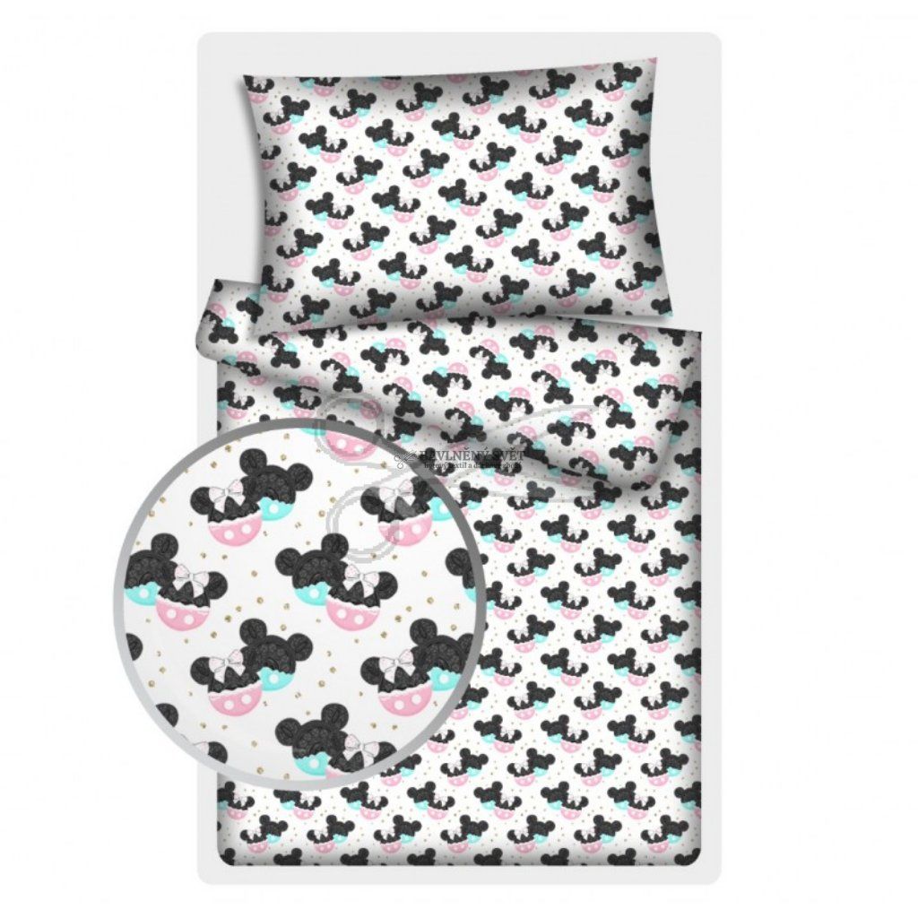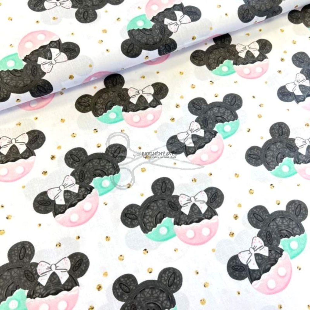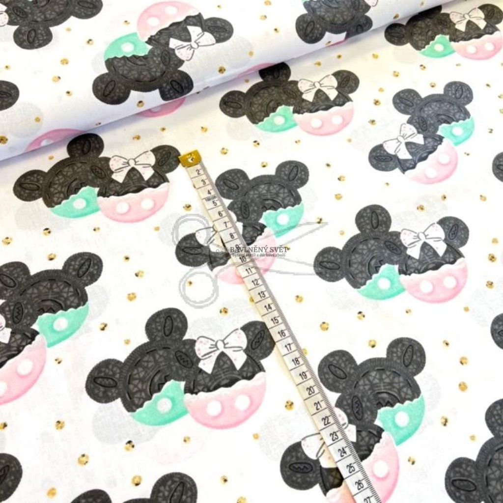 Pokud hledáte látku, která spojuje světově oblíbený motiv se svěžími pastelovými barvami, tato kombinace mentolové a růžové na bílém podkladu je přesně pro vás. Vzor působí velmi jemně a díky decentním zlatým detailům, které tvoří třpytivé pozadí, získává látka luxusní a moderní vzhled. Je jako stvořená pro výrobu celých výbaviček pro miminka, kde vynikne v kombinaci s jednobarevným minky nebo vaflovou bavlnou v odpovídajících tónech.