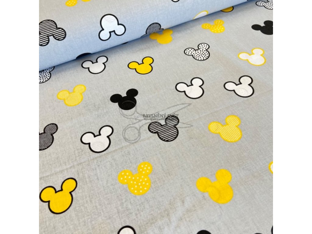 Bavlněná látka MICKEY žlutý na ŠEDÉM šíře 160 cm