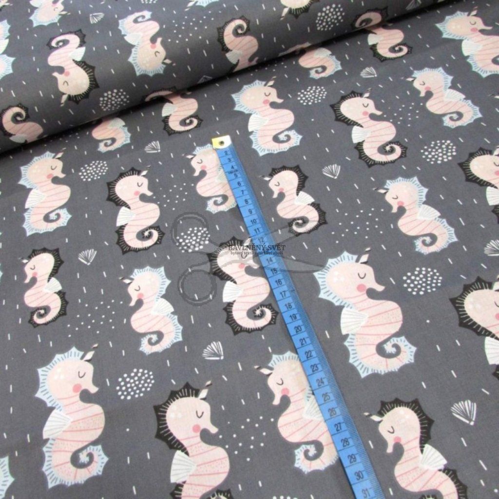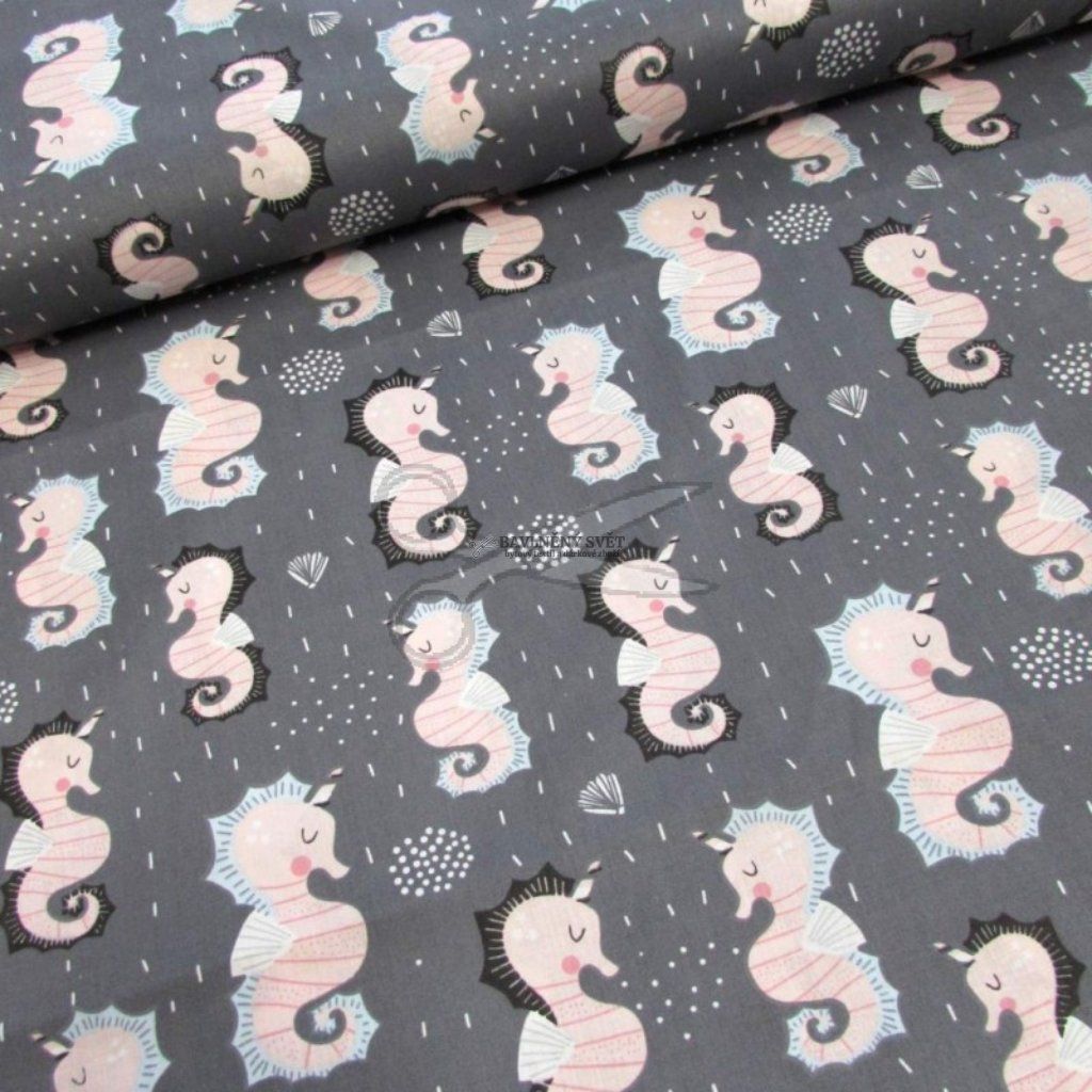 Bavlněná látka MOŘSKÝ KONÍK na ŠEDÉM šíře 160 cm