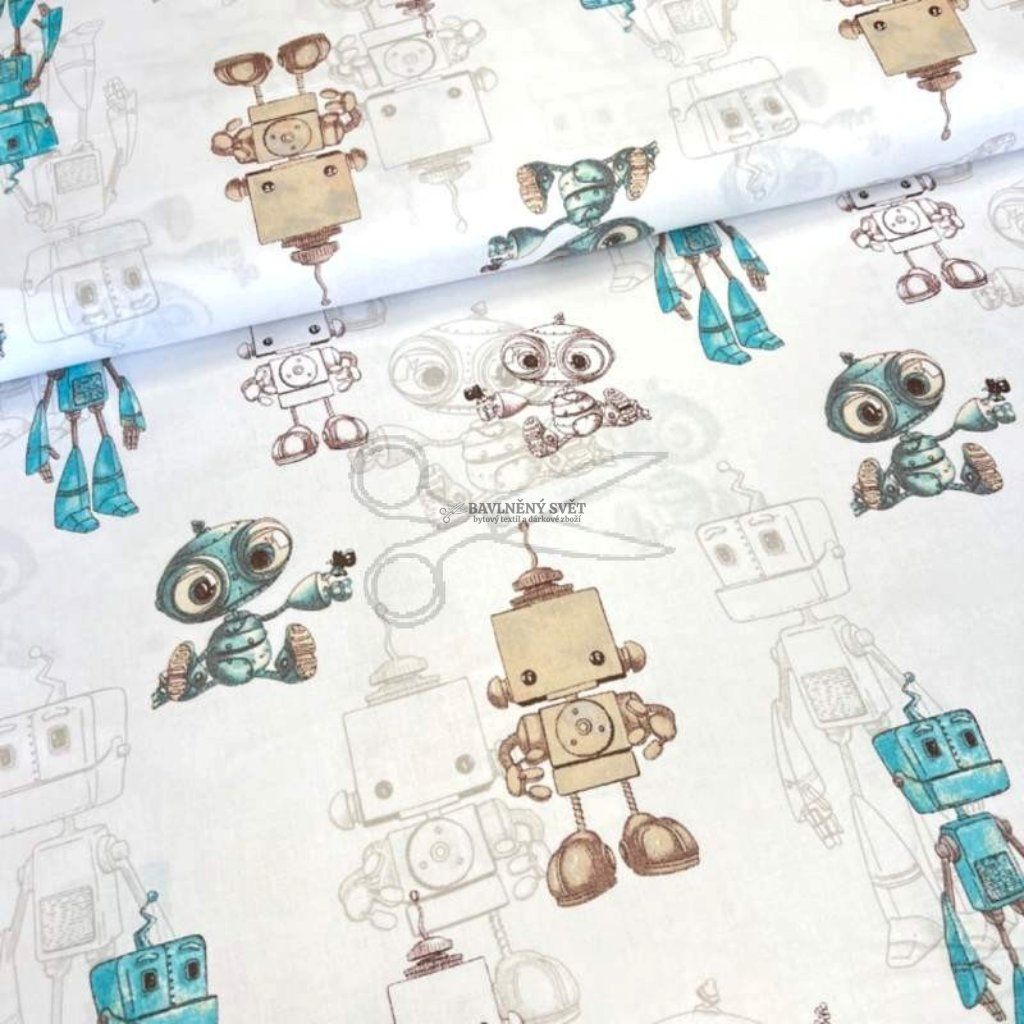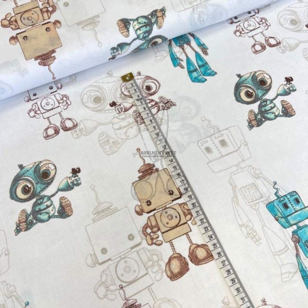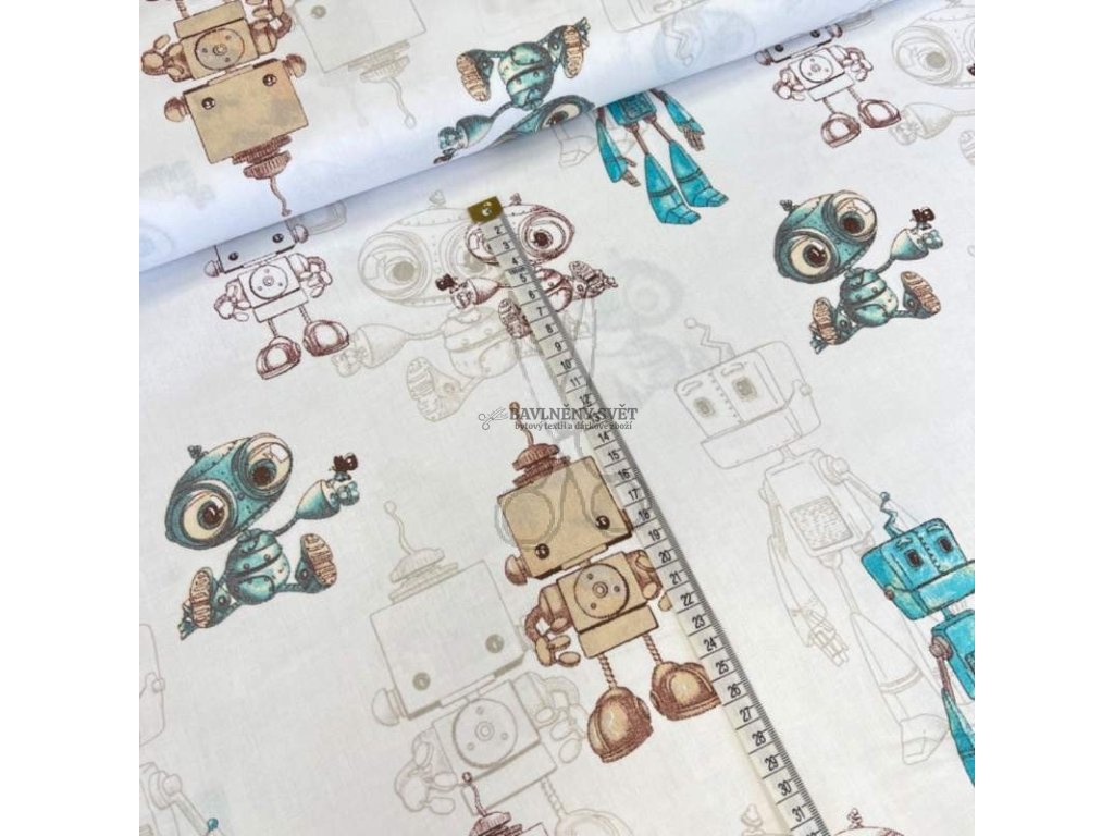 Bavlněná látka ROBOTI hnědo tyrkysoví šíře 160 cm