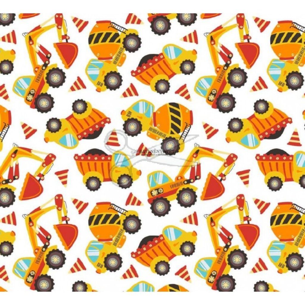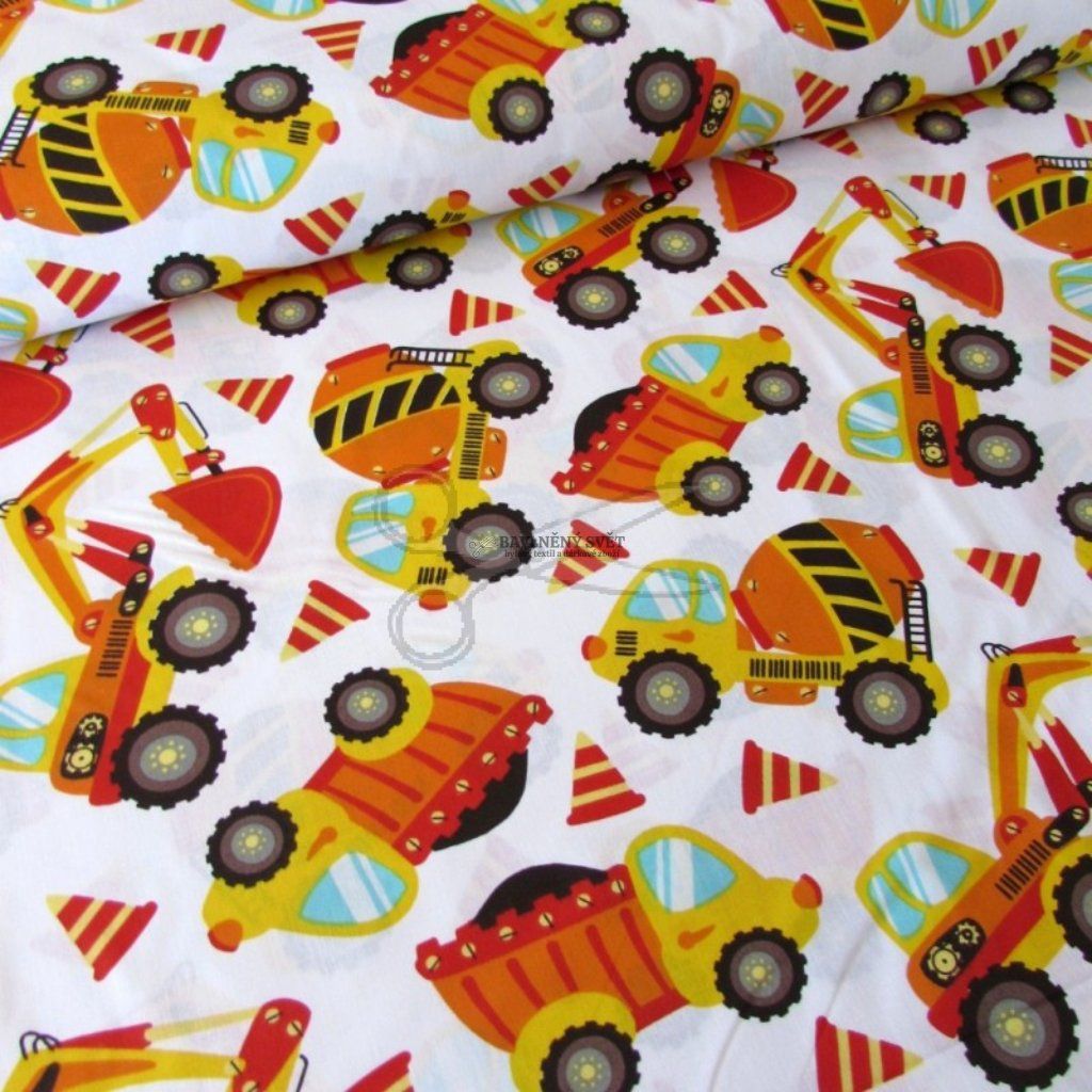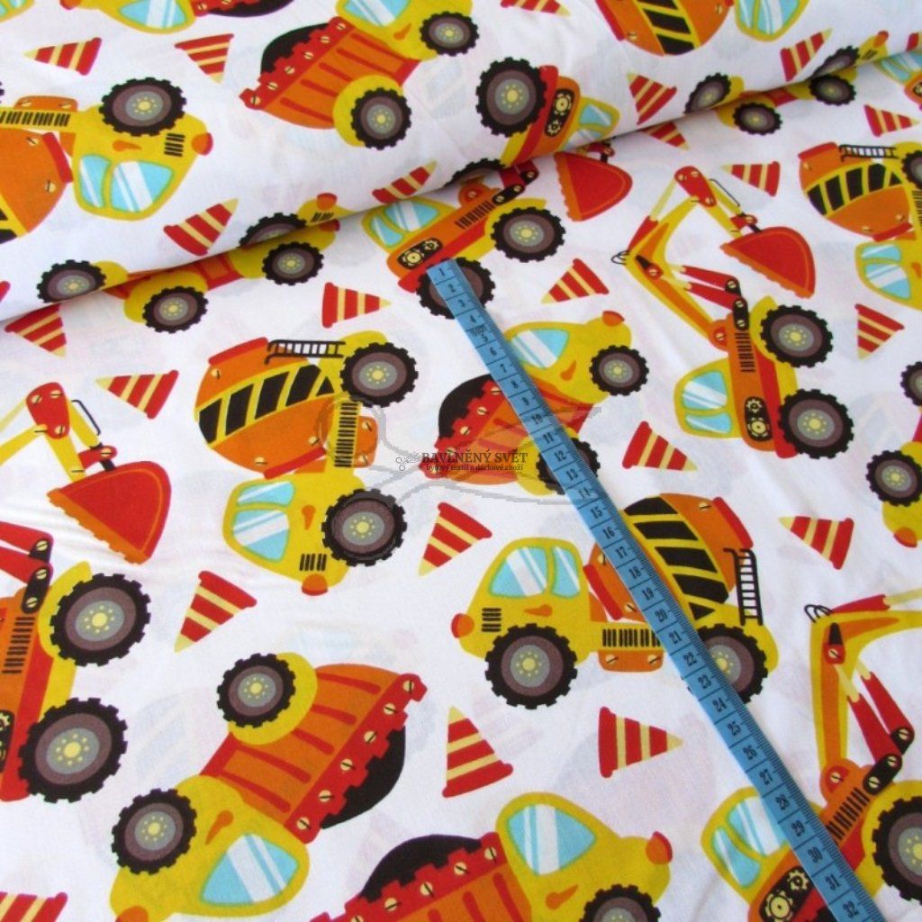 Bavlněná látka STAVEBNÍ STROJE na BÍLÉM šíře 160 cm