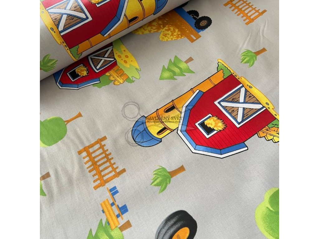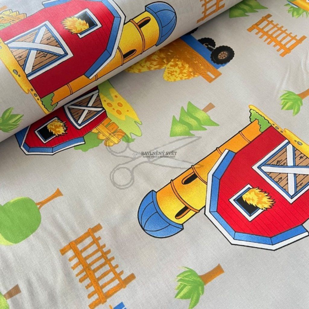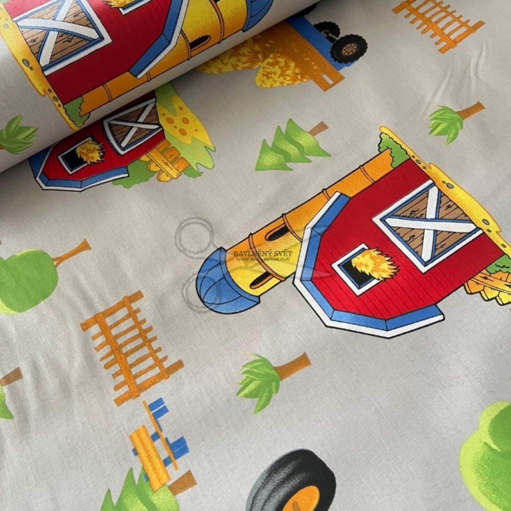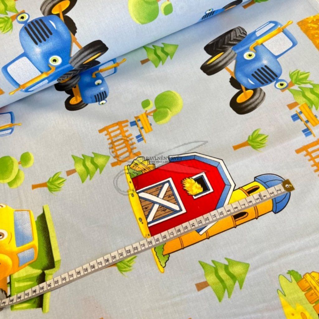 Bavlněná látka TRAKTŮREK na FARMĚ na BÉŽOVÉM šíře 240 cm