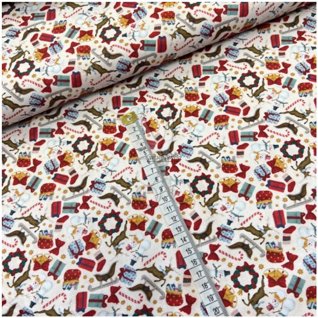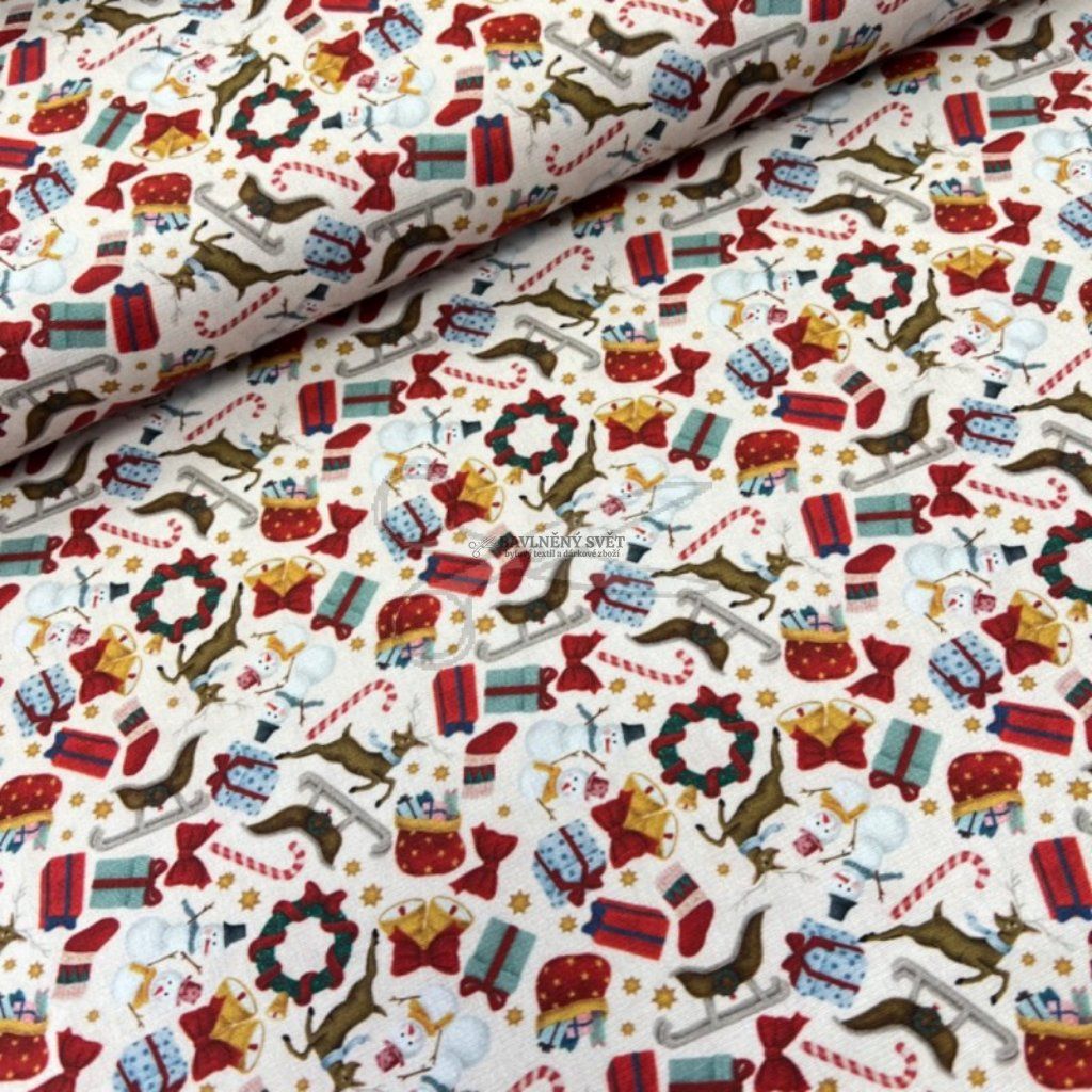Bavlněná látka VÁNOČNÍ DÁREČKY a SNĚHULÁCI šíře 147 cm