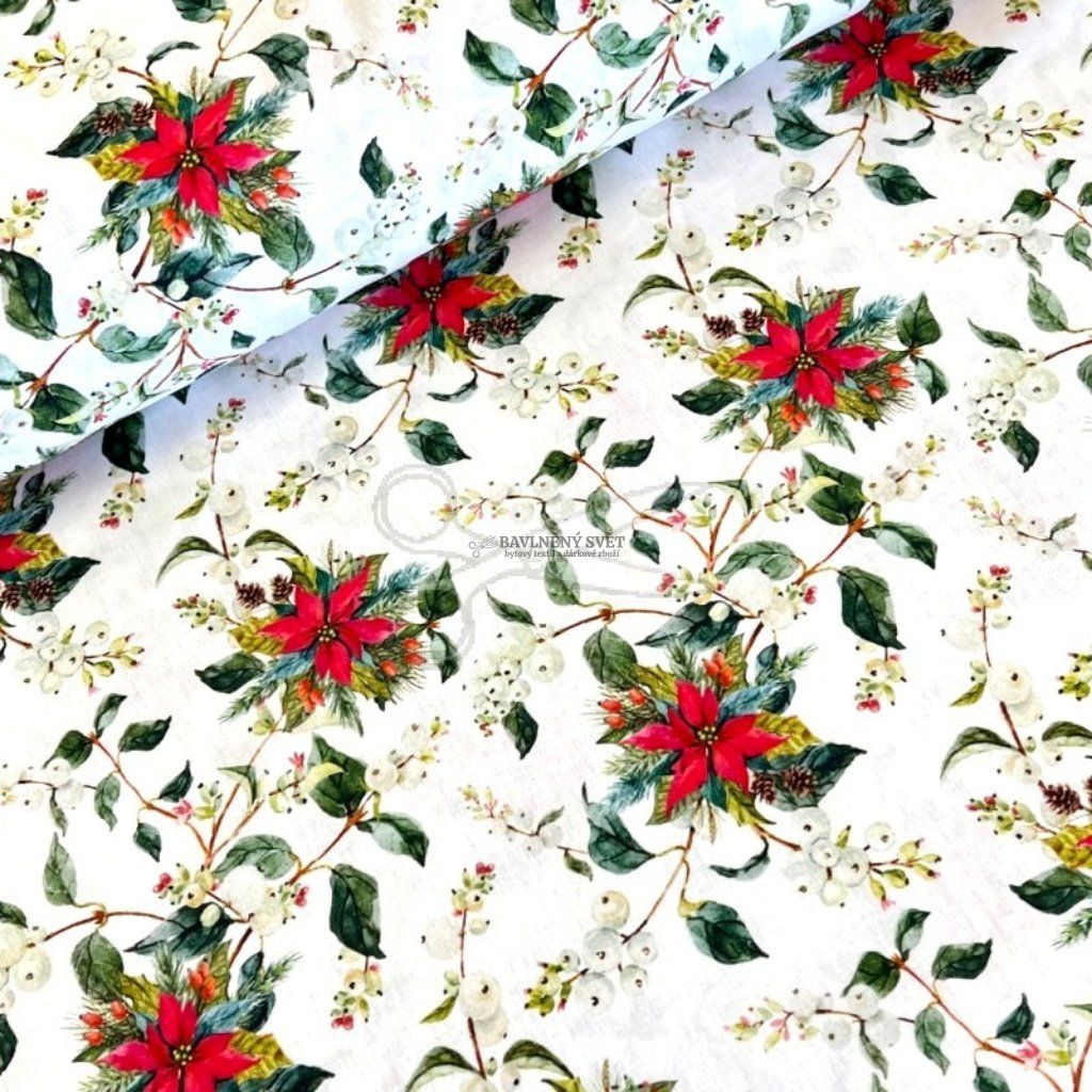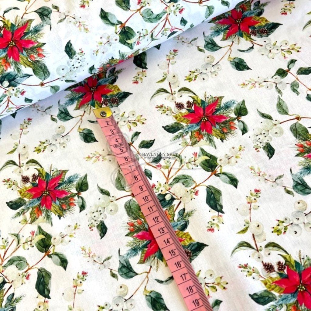 Proměňte svůj interiér v kouzelné místo plné vánoční inspirace. Tato látka vyniká jemnou, ale pevnou vazbou bavlněného plátna, které je velmi příjemné na dotek a skvěle si drží svůj tvar. Motiv vánoční hvězdy je zpracován s vysokým důrazem na detail, díky čemuž působí hotové výrobky velmi vkusně a profesionálně.