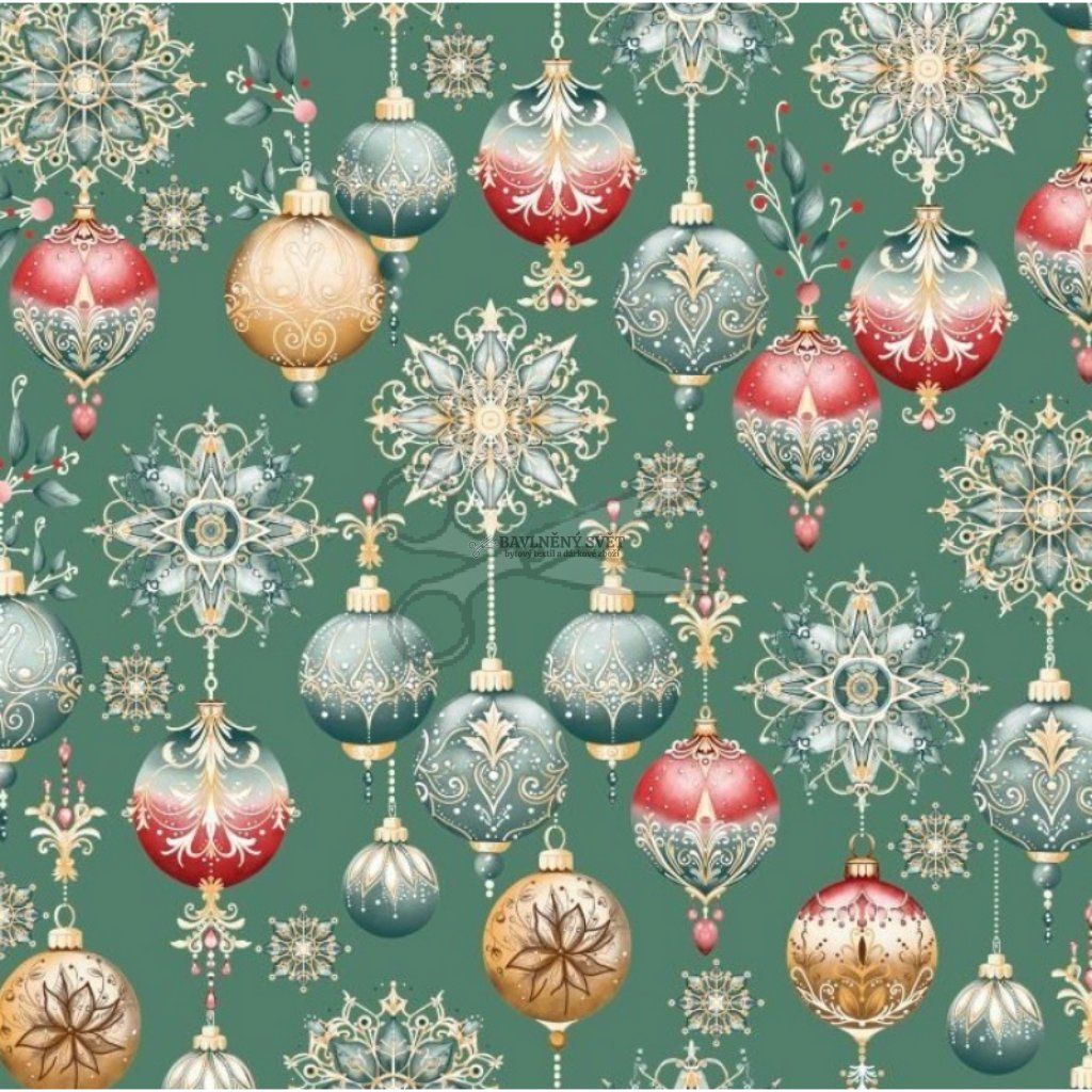 Bavlněná látka VÁNOČNÍ KOULE zelené šíře 160 cm