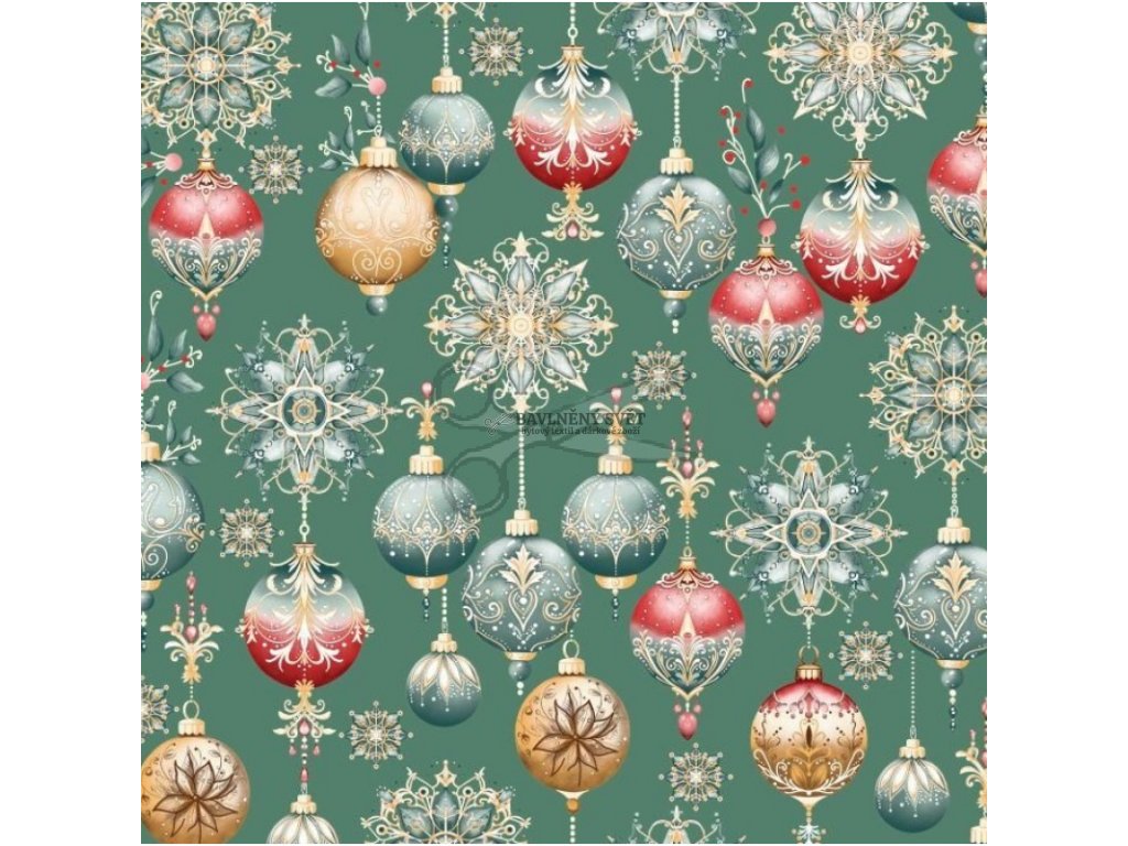 Pokud hledáte látku, která do vašeho domova vnese klasickou vánoční atmosféru v sytých barvách, tento motiv s detailně zdobenými vánočními koulemi v červených, zlatých a bílých tónech je přesně pro vás. Kontrastní spojení tmavě zeleného podkladu a pestrých baněk působí velmi luxusně a okamžitě upoutá pozornost u štědrovečerní tabule.