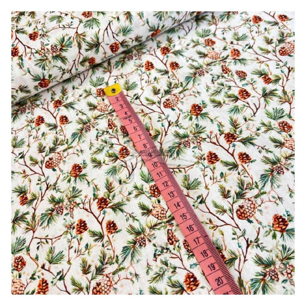 Pokud letos plánujete tvořit v přírodním nebo rustikálním stylu, tento vzor s detailně vykreslenými šiškami a větvičkami je ideálním základem. Kombinace hnědých a zelených tónů na krémovém podkladu působí velmi harmonicky a snadno ji doplníte o materiály jako juta, len nebo dřevo. Látka vyniká svou jemností a hustou vazbou, což ji předurčuje pro výrobu drobných bytových doplňků, u kterých záleží na každém detailu.