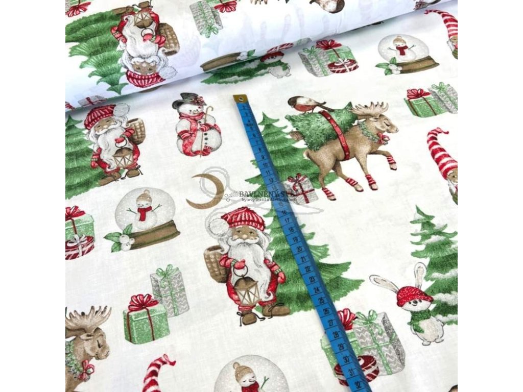 Pokud hledáte látku, která do dětského pokoje vnese pravou pohádkovou atmosféru plnou příběhů, tento motiv se skřítky s lucerničkami, soby nesoucími stromeček a sněhuláky v kouli je pro vás to pravé. Každý detail, od malého zajíčka v kulichu až po balíčky s mašlemi, je vykreslen s láskou a hravostí.