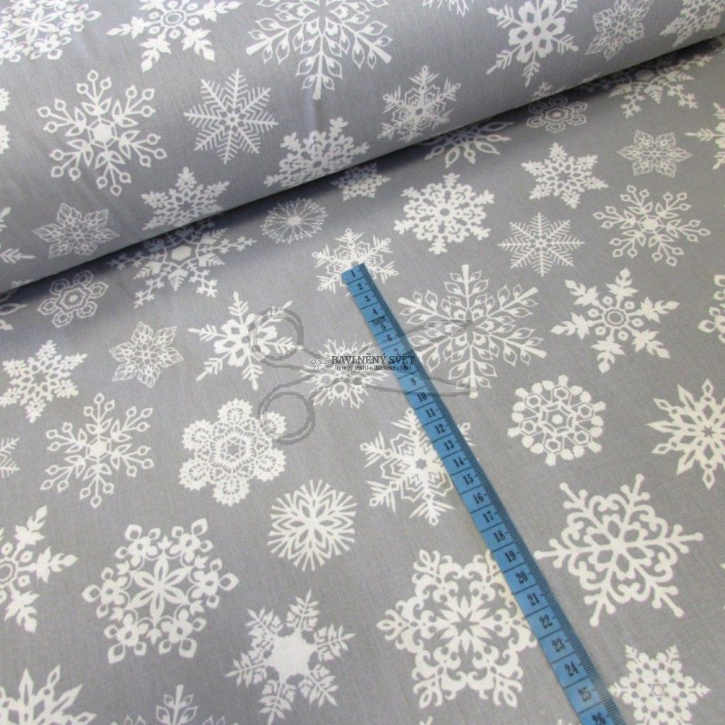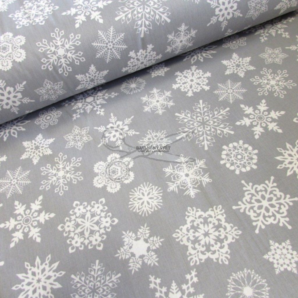 Bavlněná látka VÁNOČNÍ SNĚHOVÉ VLOČKY bílé na ŠEDÉM šíře 240 cm