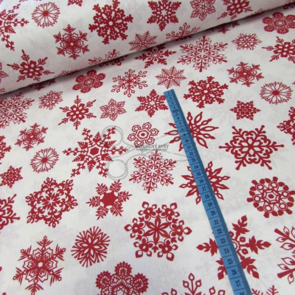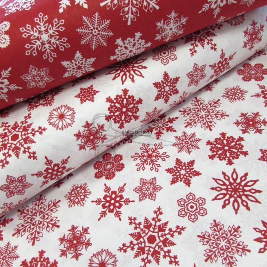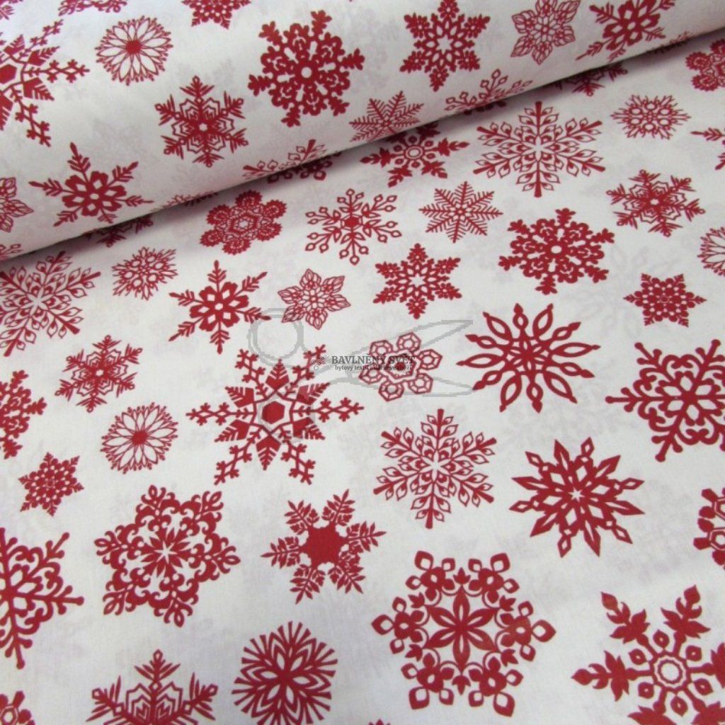 Bavlněná látka VÁNOČNÍ SNĚHOVÉ VLOČKY červené na BÍLÉM šíře 240 cm
