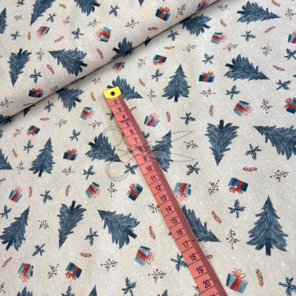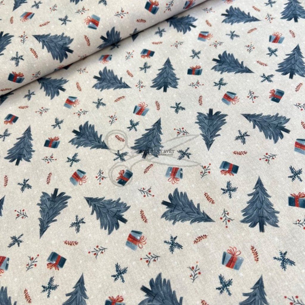 Pokud hledáte alternativu k tradiční červeno-zelené klasice, tento vzor v tlumených tónech je přesně pro vás. Kombinace modro-šedých stromečků a decentních dárků na podkladu v přírodní barvě působí velmi jemně a nadčasově. Látka je jako stvořená pro výrobu drobných dekorací v severském stylu, jako jsou textilní přívěsky ve tvaru hvězd, jemné girlandy nebo adventní kalendáře, které budou vypadat vkusně v každém moderním bytě.