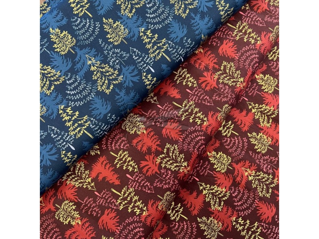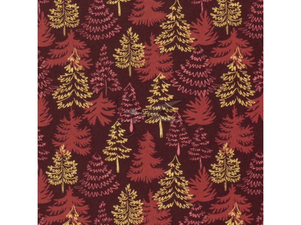 Pokud hledáte alternativu k zářivě jasným barvám a preferujete spíše hluboké, syté tóny, tento vzor s vínovým základem a propracovanými detaily je přesně pro vás. Kombinace vrstvených stromečků v červených a vínových odstínech s decentním zlatotiskem působí velmi vkusně a nadčasově. Látka je jako stvořená pro výrobu výrazných bytových doplňků, jako jsou vánoční ubrusy, elegantní běhouny přes střed stolu nebo luxusní povlaky na polštáře, které se stanou dominantou obývacího pokoje.