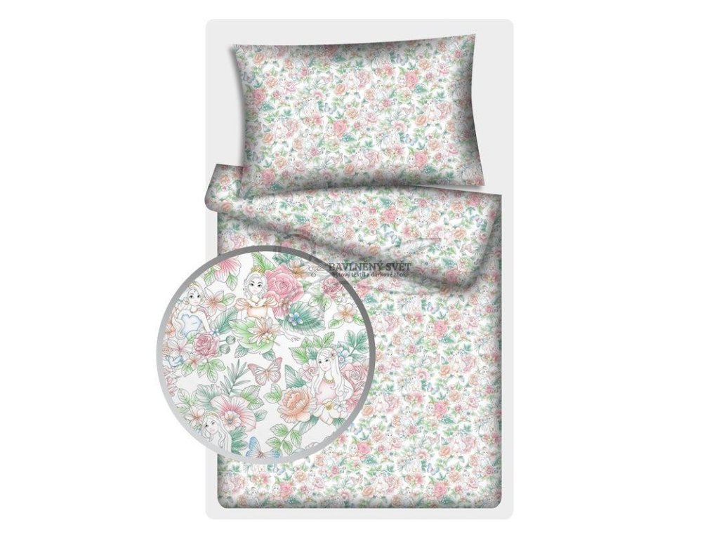 Pokud hledáte látku, která do dětského království vnese nádech fantazie a snovou atmosféru, tento motiv s pohádkovou vílou a bohatými květinovými věnci je tou správnou volbou. Detailní ilustrace růží, exotických listů a poletujících motýlů působí velmi jemně a díky harmonickému spojení barev se snadno kombinuje s dalšími pastelovými doplňky.