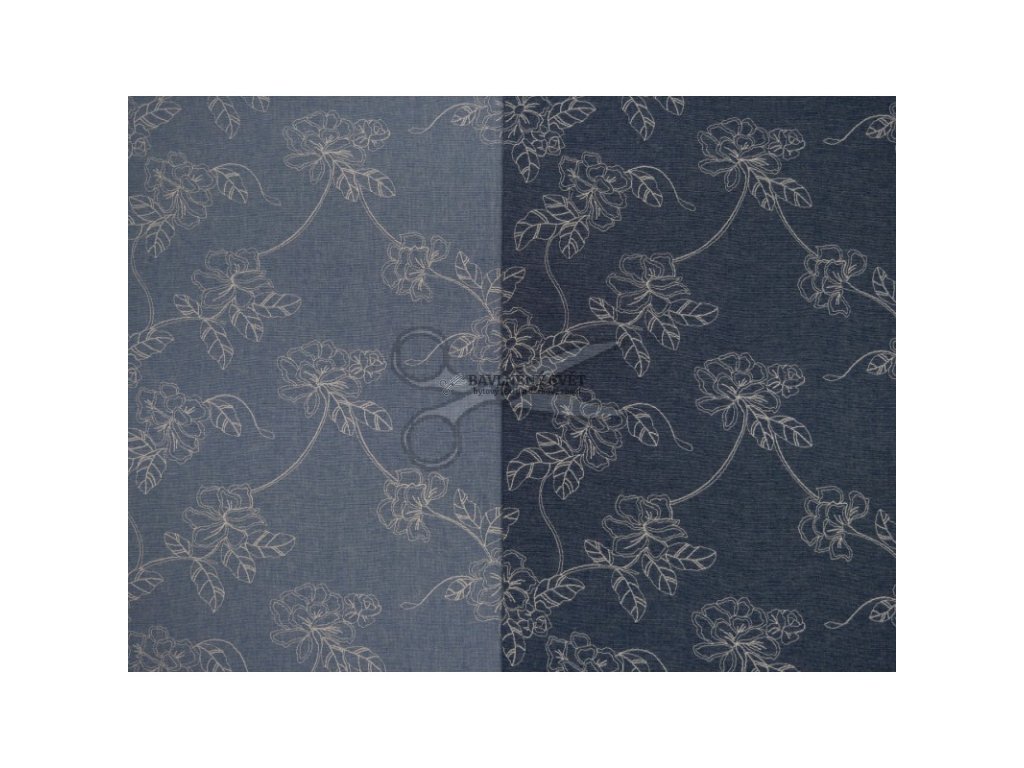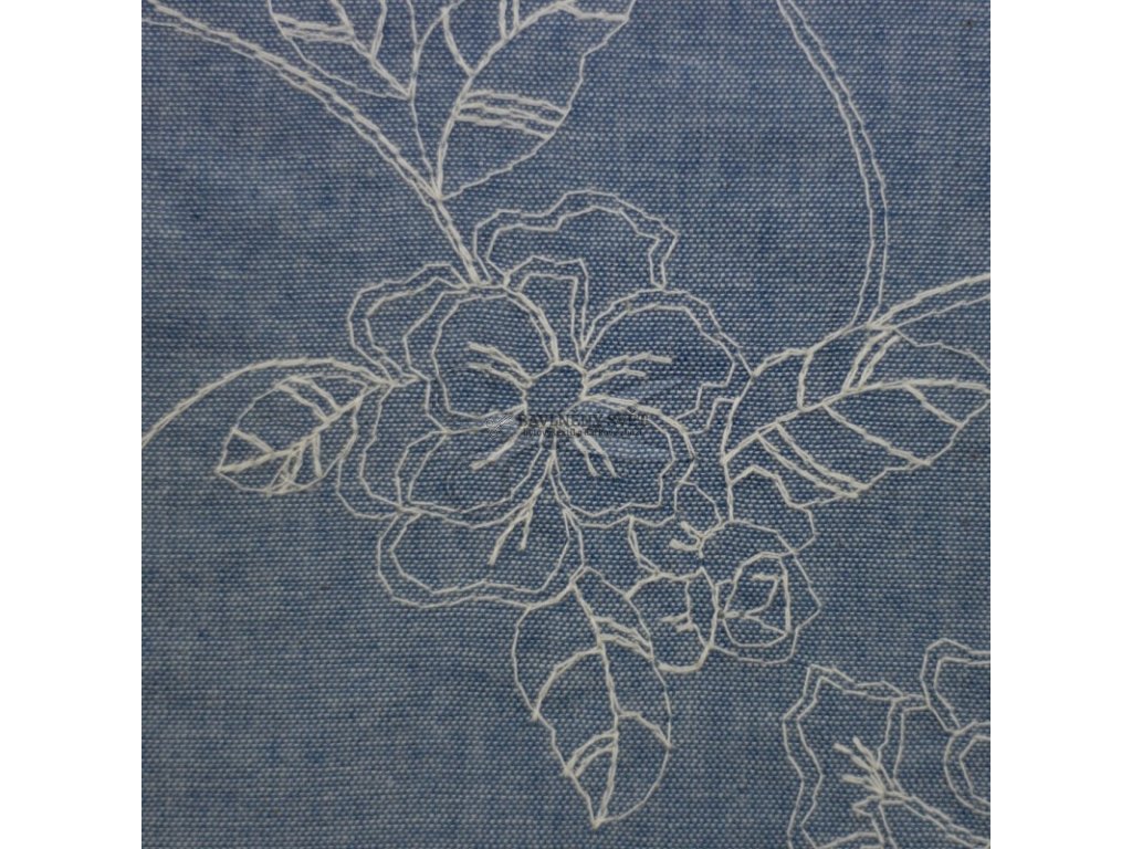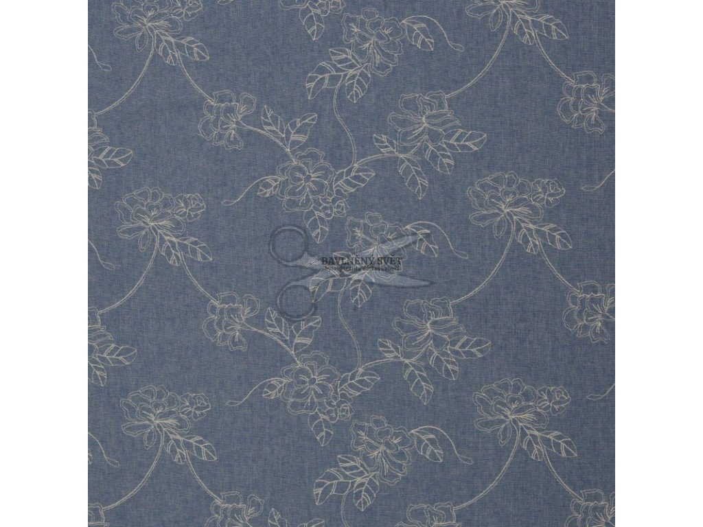 Vzhled: Světle modrý denimový podklad s jemnou světlou výšivkou.
