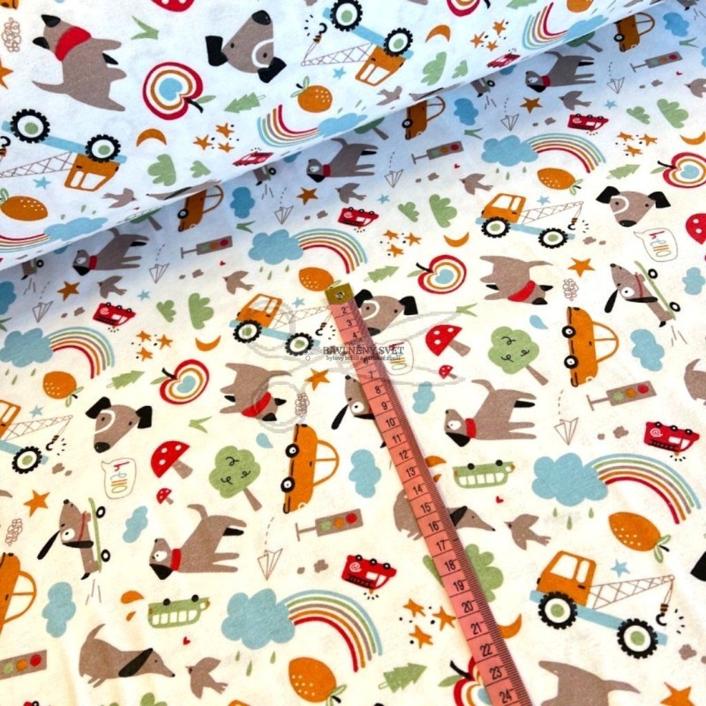Bavlněný flanel s motivem autíček, pejsků a duhy okamžitě vdechne radost a teplo do každého dětského pokoje. Díky svému čistě přírodnímu složení je látka mimořádně šetrná k pokožce, což z ní činí nejoblíbenější materiál pro chladnější měsíce. Hlavním benefitem je šíře 240 cm, která umožňuje šití i velkých přehozů, nebo hracích dek bez nutnosti sešívání látky.