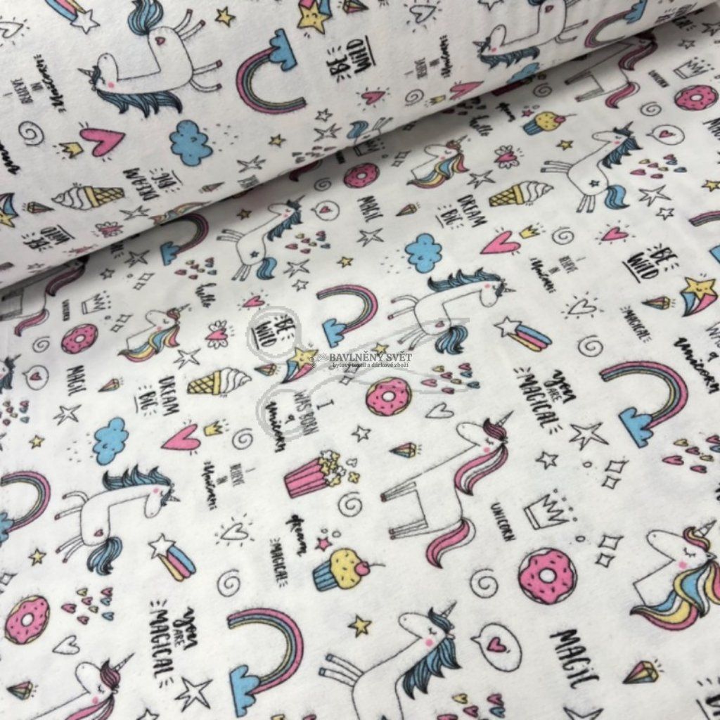 Bavlněný flanel JEDNOROŽEC a DUHA šíře 240 cm