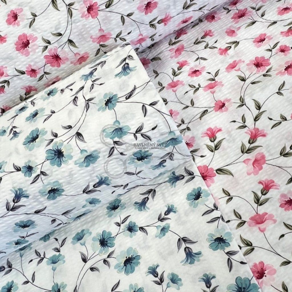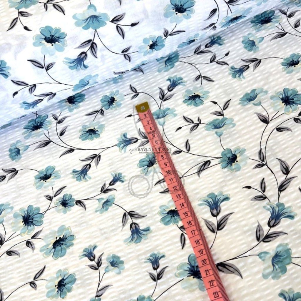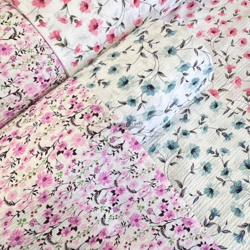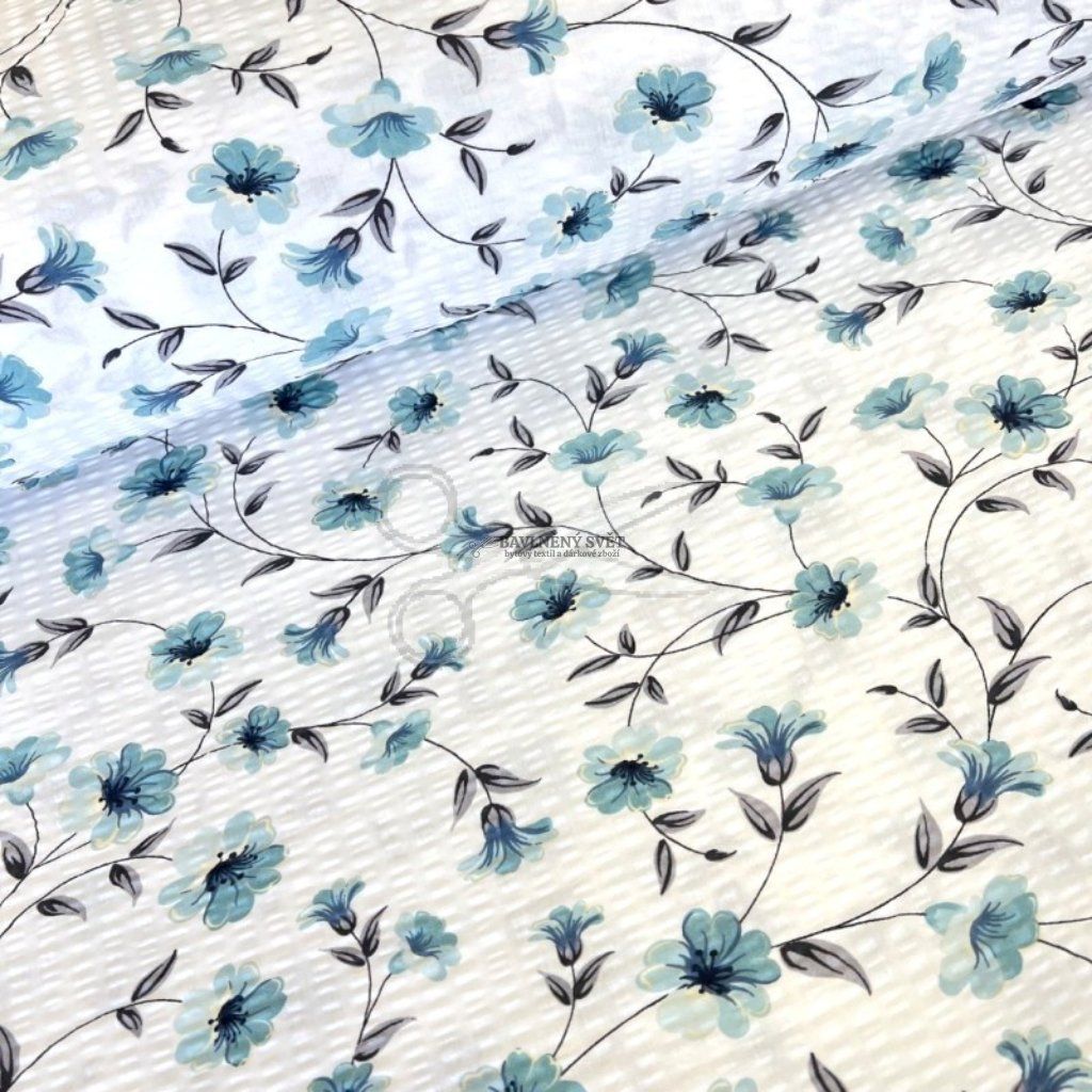 Bavlněný krep s něžným květinovým vzorem Heda v tyrkysových odstínech vdechne vaší ložnici romantickou a svěží atmosféru. Tento materiál je vyroben ze 100% čisté bavlny o gramáži 135 g/m², která prochází speciální úpravou. Výsledkem je charakteristický krepový (vlnkovitý) povrch, který je nejen příjemný na dotek, ale především se nemusí žehlit. Hlavním benefitem je nadstandardní šíře 240 cm, díky které snadno ušijete i francouzské povlečení na dvoulůžko z jednoho kusu látky.