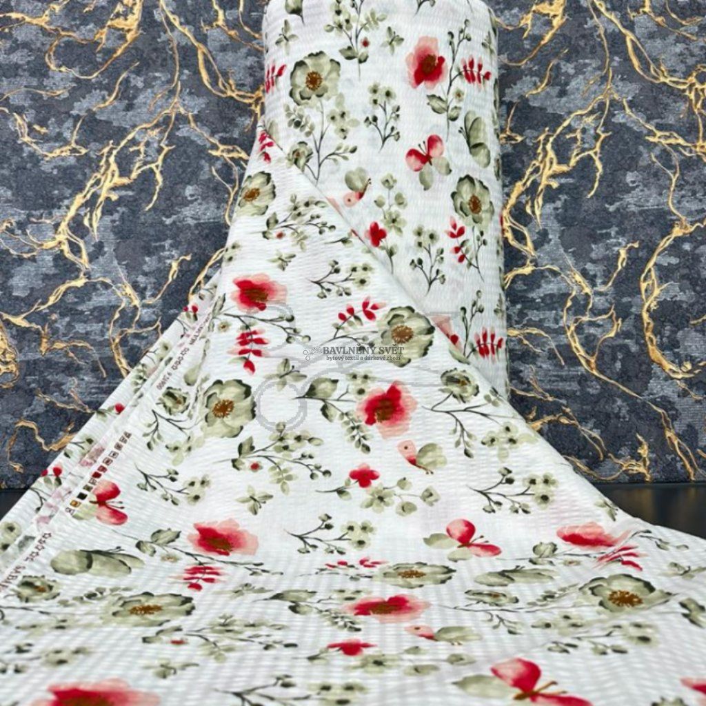 Bavlněný krep s něžným květinovým vzorem a s poletujícími motýly vdechne vaší ložnici romantickou a svěží atmosféru. Tento materiál je vyroben ze 100% čisté bavlny, která prochází speciální úpravou. Výsledkem je charakteristický krepový (vlnkovitý) povrch, který je nejen příjemný na dotek, ale především se nemusí žehlit. Hlavním benefitem je nadstandardní šíře 240 cm, díky které snadno ušijete i francouzské povlečení na dvoulůžko z jednoho kusu látky.