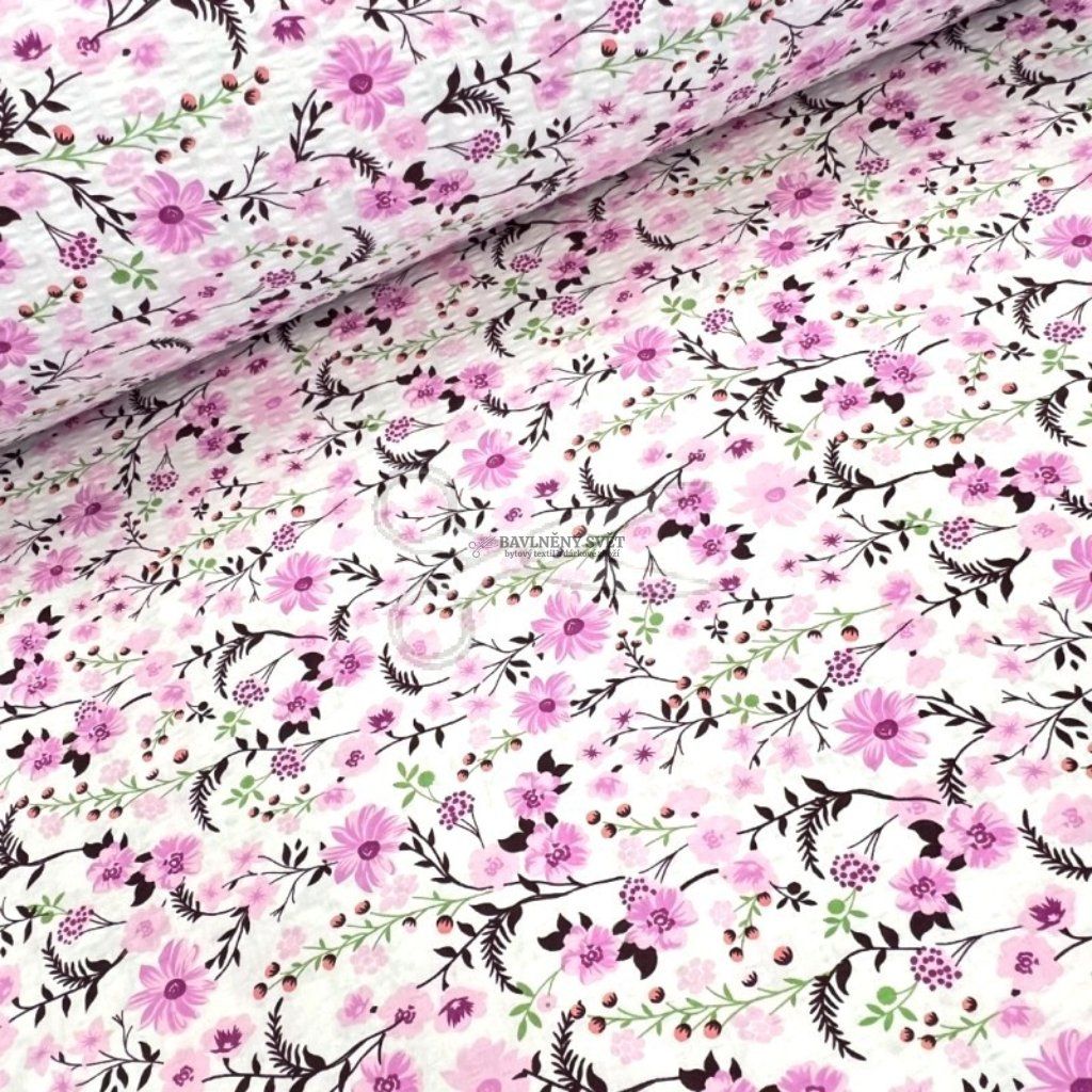 Bavlněný krep s něžným květinovým vzorem drobných růžovo fialových květů vdechne vaší ložnici romantickou a svěží atmosféru. Tento materiál je vyroben ze 100% čisté bavlny, která prochází speciální úpravou. Výsledkem je charakteristický krepový (vlnkovitý) povrch, který je nejen příjemný na dotek, ale především se nemusí žehlit. Hlavním benefitem je nadstandardní šíře 240 cm, díky které snadno ušijete i francouzské povlečení na dvoulůžko z jednoho kusu látky.