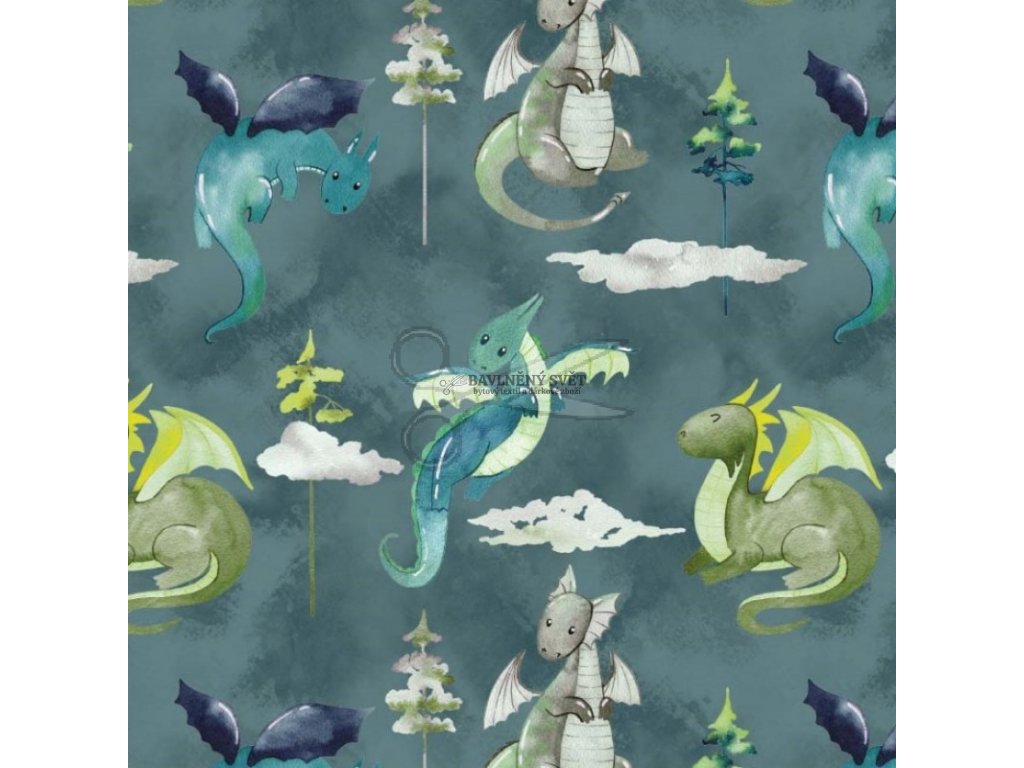 Bavlněný úplet DRÁČCI na PETROLEJOVÉM šíře 150 cm