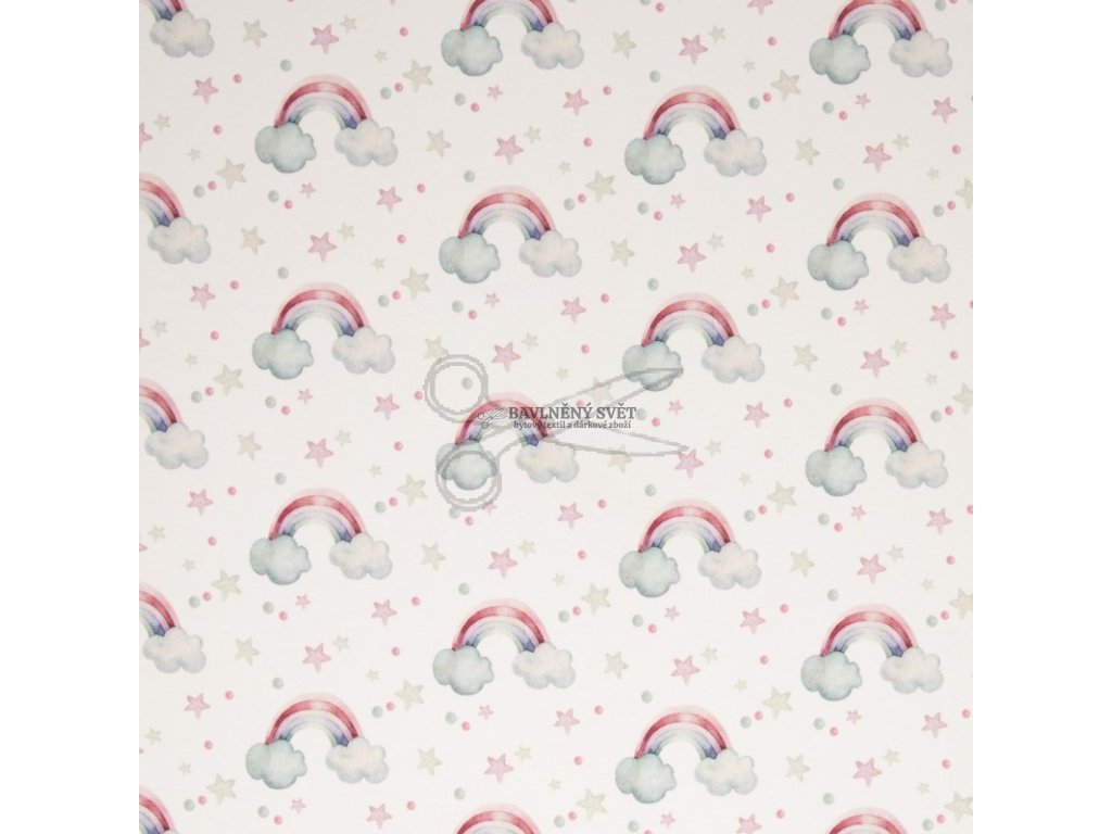 Tento něžný úplet s elastanem zaujme veselým motivem duhy, mráčků a hvězdiček na čistě bílém podkladu. Jemné barvy a hravý design působí nadčasově a radostně, ideální pro malé slečny. Látka je měkká, pružná a příjemná na nošení, díky elastanu se dobře přizpůsobí pohybu. Skvěle se hodí na šití šatů, sukní, triček, tunik a pyžamek, které děti rády nosí doma i venku.