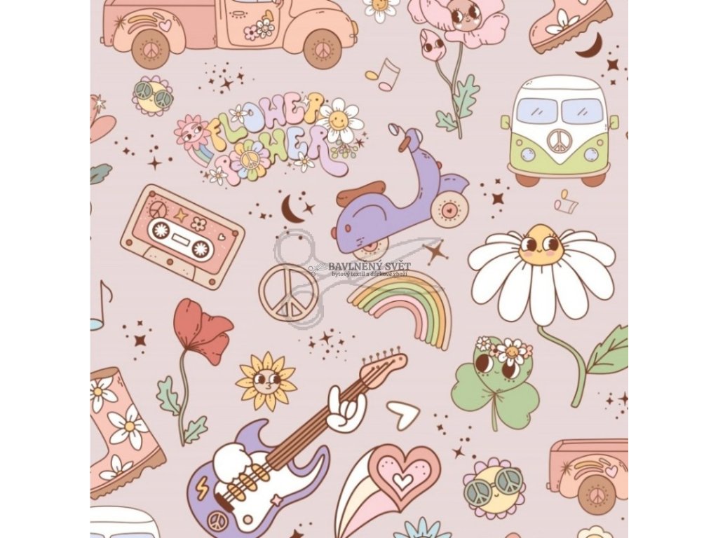 Hledáte látku, která vypráví příběh a okamžitě upoutá pozornost? Náš úplet FLOWER POWER na starorůžovém podkladu je plný hravých detailů – od ikonických dodávek, skútrů a kytar až po usměvavé květiny, duhy a kazety. Díky příměsi elastanu je materiál vysoce pružný, skvěle se přizpůsobí postavě a ani po mnoha vypráních neztrácí svůj tvar.