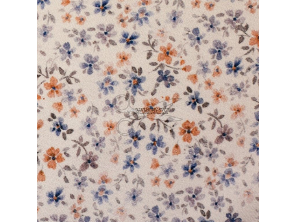 Tento bavlněný úplet s motivem květinek v modré a skořicové barvě představuje dokonalou harmonii barev pro váš šatník. Světlý podklad dává vyniknout jemným detailům kytiček, zatímco skořicové akcenty dodávají vzoru hřejivost a modré tóny zase svěžest. Materiál je tvořen vysoce kvalitní bavlnou s příměsí elastanu, což zajišťuje, že je látka krásně poddajná, nevytahuje se a skvěle se přizpůsobí postavě.