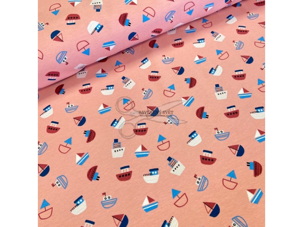 Bavlněný úplet LOĎKY na RŮŽOVÉM šíře 145 cm