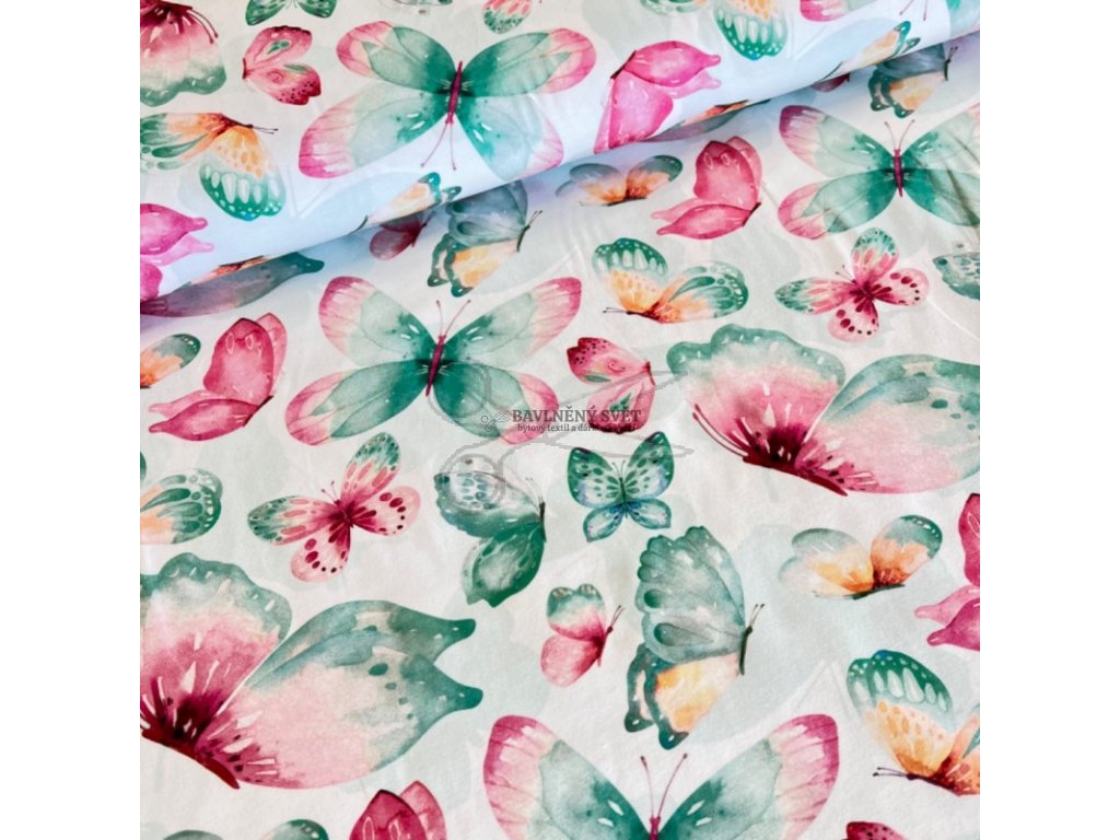 Bavlněný úplet MOTÝLCI růžovo mentoloví šíře 150 cm