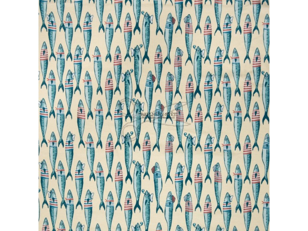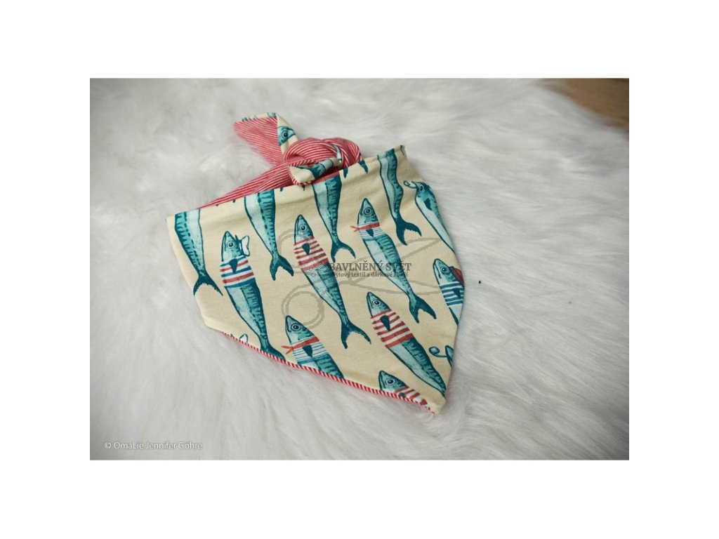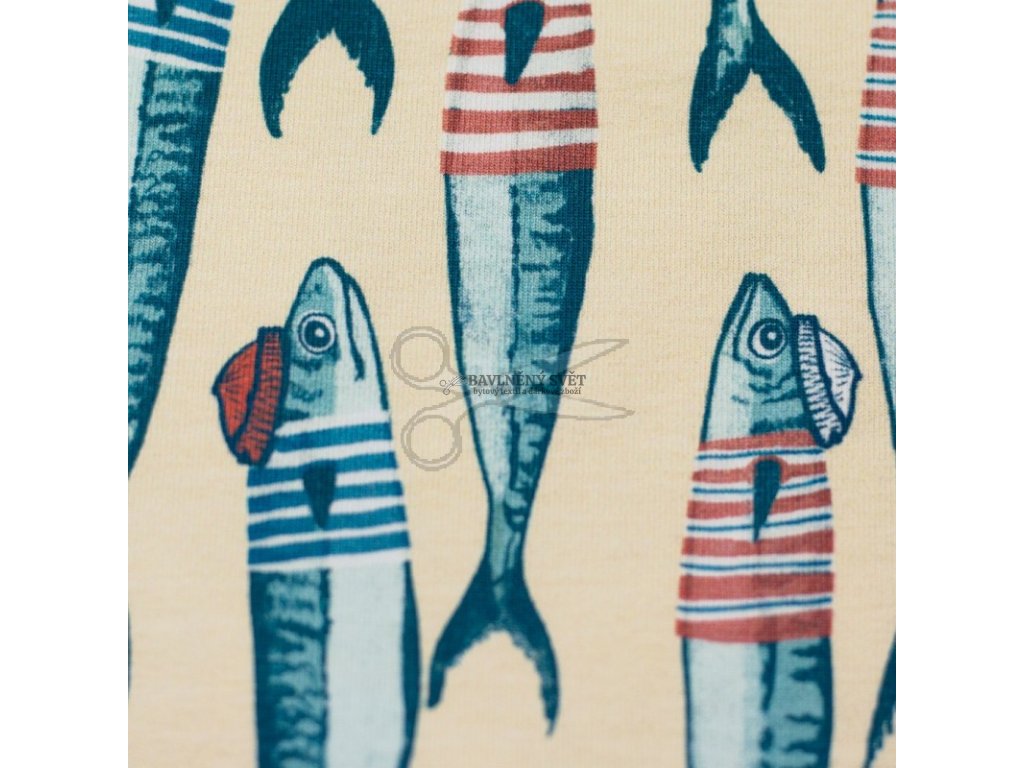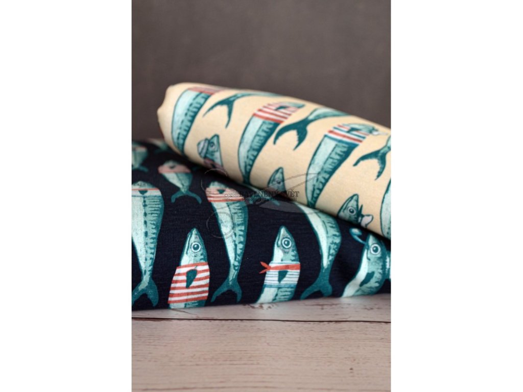 Kvalitní bavlněný úplet s příměsí elastanu s originálním motivem sardinek zaujme na první pohled. Vanilkový podklad v kombinaci s modro-tyrkysovými odstíny a jemnými detaily působí hravě, ale zároveň stylově, takže látka krásně funguje jak v dětské, tak i dospělé módě. Úplet je příjemně měkký, pružný a pohodlný na nošení. Skvěle se hodí na šití triček, mikin, legín, šatů, pyžam nebo domácího oblečení. Díky univerzálnímu vzoru je ideální i na sladěné kousky pro celou rodinu.