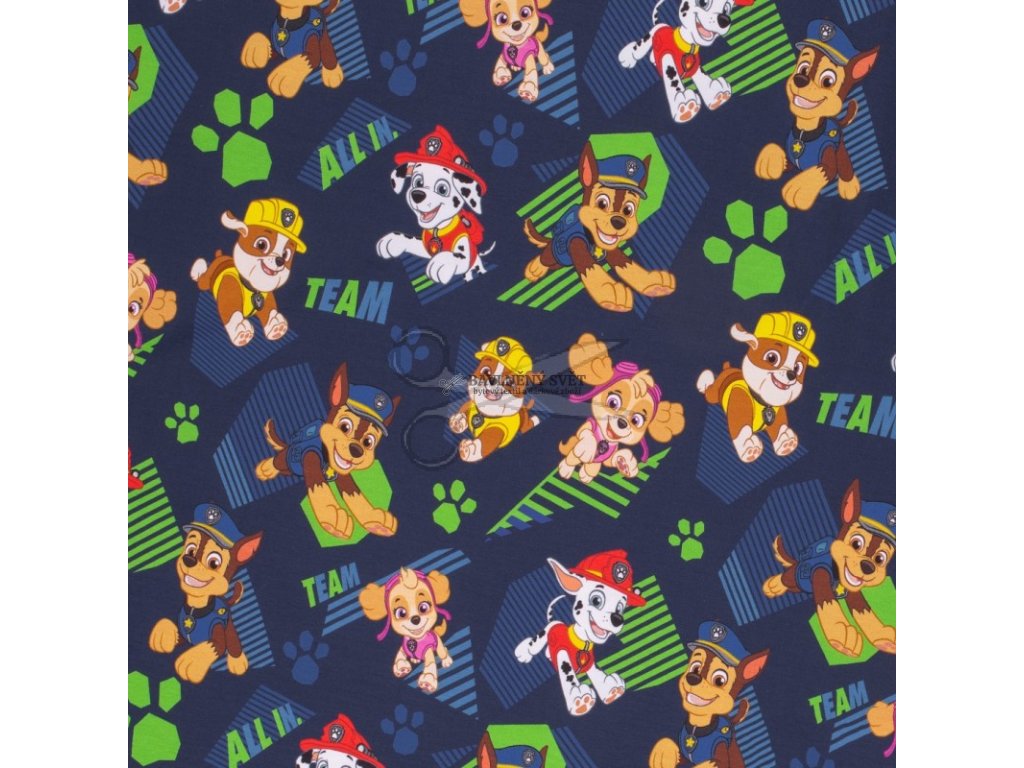 Bavlněný úplet TLAPKOVÁ PATROLA modro zelená šíře 155 cm