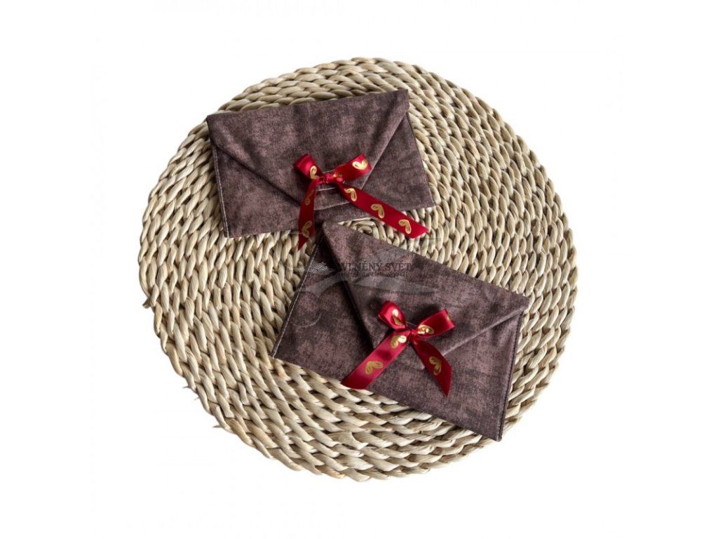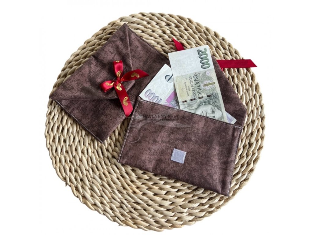 Hnědý melír v kombinaci s červenou mašličkou se zlatými srdíčky působí elegantně a slavnostně. Je to ideální řešení, pokud nevíte, co koupit, a raději darujete peníze, aby si obdarovaný udělal radost podle svého.