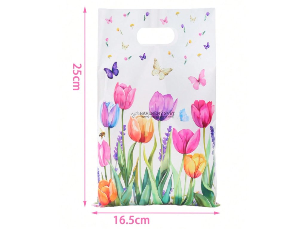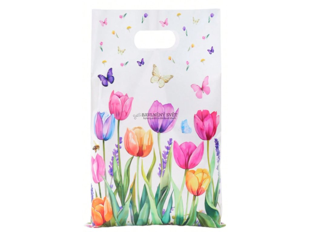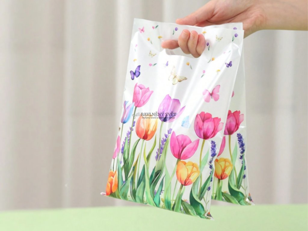 Dodejte svým výrobkům nádech jara a profesionality. Tato dárková plastová taška TULIPÁNY s motivem barevných květů okamžitě rozzáří každý dárek. Je navržena tak, aby stylově doplnila látky a materiály z našeho e-shopu Bavlněný svět a udělala radost všem, kteří milují květinové vzory.