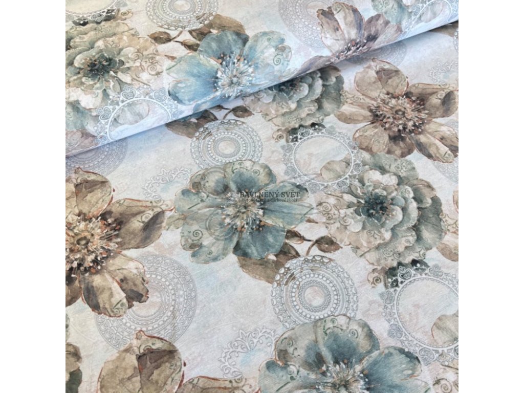 Dekorační látka loneta KVĚTY Esmeralda šíře 140 cm